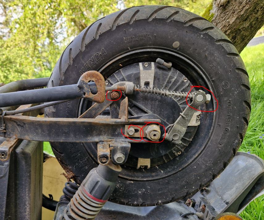Die ganzen Schrauben im Bereich Schwinge/Motor benötigen ordentlich WD40. Der Trommelbremszug ist noch recht gut. Praktischerweise kann man die Justierschraube für die Trommelbremse immer noch mit der Hand drehen, um diese Nachzustelllen. Bei meinem eSwan und 4600km ist es jetzt tatsächlich so, dass der Bremsheben bis an den Griff gezogen keine Dolle Bremsleistung mehr hat und diese Schraube nachgezogen werden muss. Da die Schraube, wenn man den Trommelbremsarm nach vorn drückt, leicht stärker anziehen.