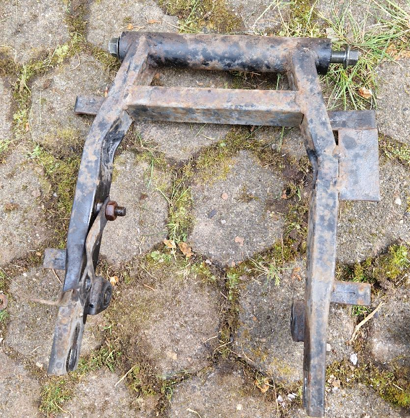 Der Motor iist mir einigen Schrauben befestigt. Auf der eigentlichen Achse sind je 2 Hauptmuttern mit 2 Kontermuttern. Diese waren auf einer Seite sehr fest, da hat sich das Gewinde etwas verformt, die Mutter ging schwer runter. Wenn man den Motor dann nach Hinten herausgezogen hat, kommt einem schon der Deckel der Trommelbremse entgegen. Hier ist auch Feuchtigkeit eingedrungen. Motor demontiert, Trommelbremsenseite Die ausgebaute Schwinge: