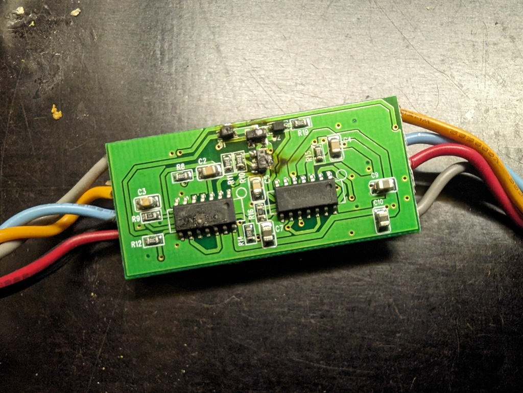 Nun gibt es ein neues Problem bzw. eines, weswegen die jetzige Besitzerin den E1S vergangenen Saison abgestellt hat und nicht mehr damit gefahren ist: die Warnblinkanlage blinkt dauerhaft, im Display blinkt zusätzlich die Werkstatt/Service Lampe im Gleichtakt. Die Blinkertaster und der Warnblinktaster sind trocken, mit Feutigkeit gab es nach Regen schon häufiger Ärger, aber dieses mal ist nicht Wasser schuld. Weitergesucht und gefunden: auf der kleinen Platine unter dem Tacho, die in Schrumpfschlauch eingepackt war, sind einige Bauteile abgeraucht (an den Stellen der Bauteile war sogar der Schrumpfschlach geschmolzen). Sie ist leider nur chinesisch beschriftet und der einzige noch intakte und ablesbare IC ist ein TI CD4013B - ein doppeltes Flip-Flop, ein Feld-Wald-und-Wiesen-Bauteil. Die anderen beiden ICs haben Brandblasen auf ihren Gehäusen, nicht mehr lesbar. Ich kann mir vorstellen, dass man Flip-Flops in einer Blinkerschaltung gut gebrauchen kann (Taster einmal drücken: an, nochmal drücken: wieder aus), aber es ist ein zu wenig markantes Bauteil, um darüber das PCB oder etwas funktional ähnliches zu finden.