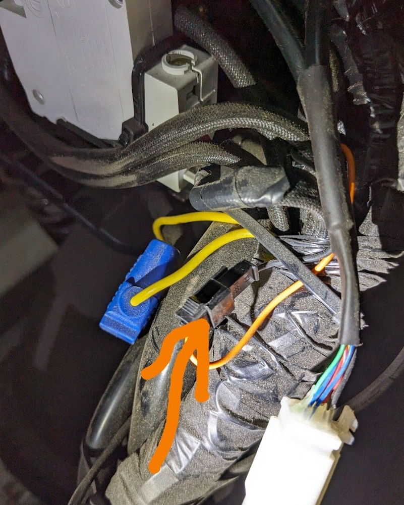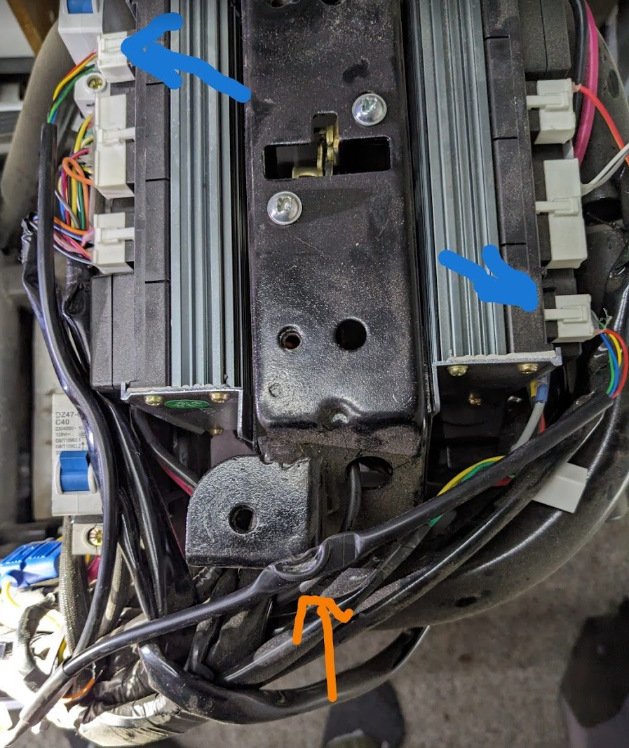 Ich habe heute auch noch mal schnell zwei Fotos gemacht von Auffälligkeiten, die ich gefunden habe (ich hoffe, ich kriege das mit dem Einfügen ordentlich hin): Dieser kleine Steckverbinder war auseinander. Ich weiß nicht, wofür die Verbindung ist, aber nach dem Zusammenstecken konnte ich keine Veränderung feststellen. Diese Y-Leitung, die zu jeweils einem Controller geht war unter der Helmschüssel auch eingequetscht (orangener Pfeil). Sie geht oder kommt von den blau markierten Anschlüssen jeweils eines Controllers. Wofür die gut ist. habe ich dem etwas kryptischen Schaltplan leider auch nicht entnehmen können.