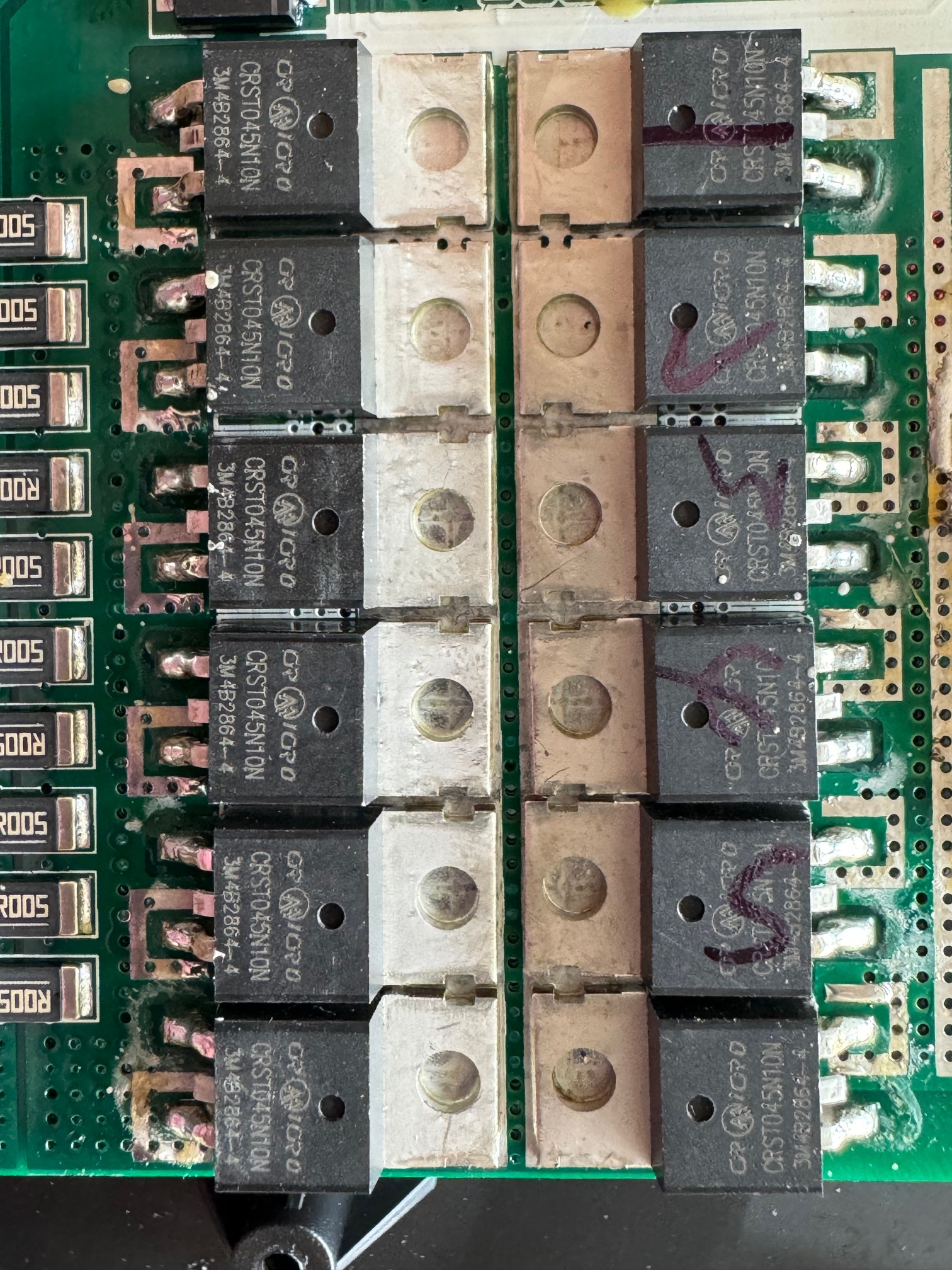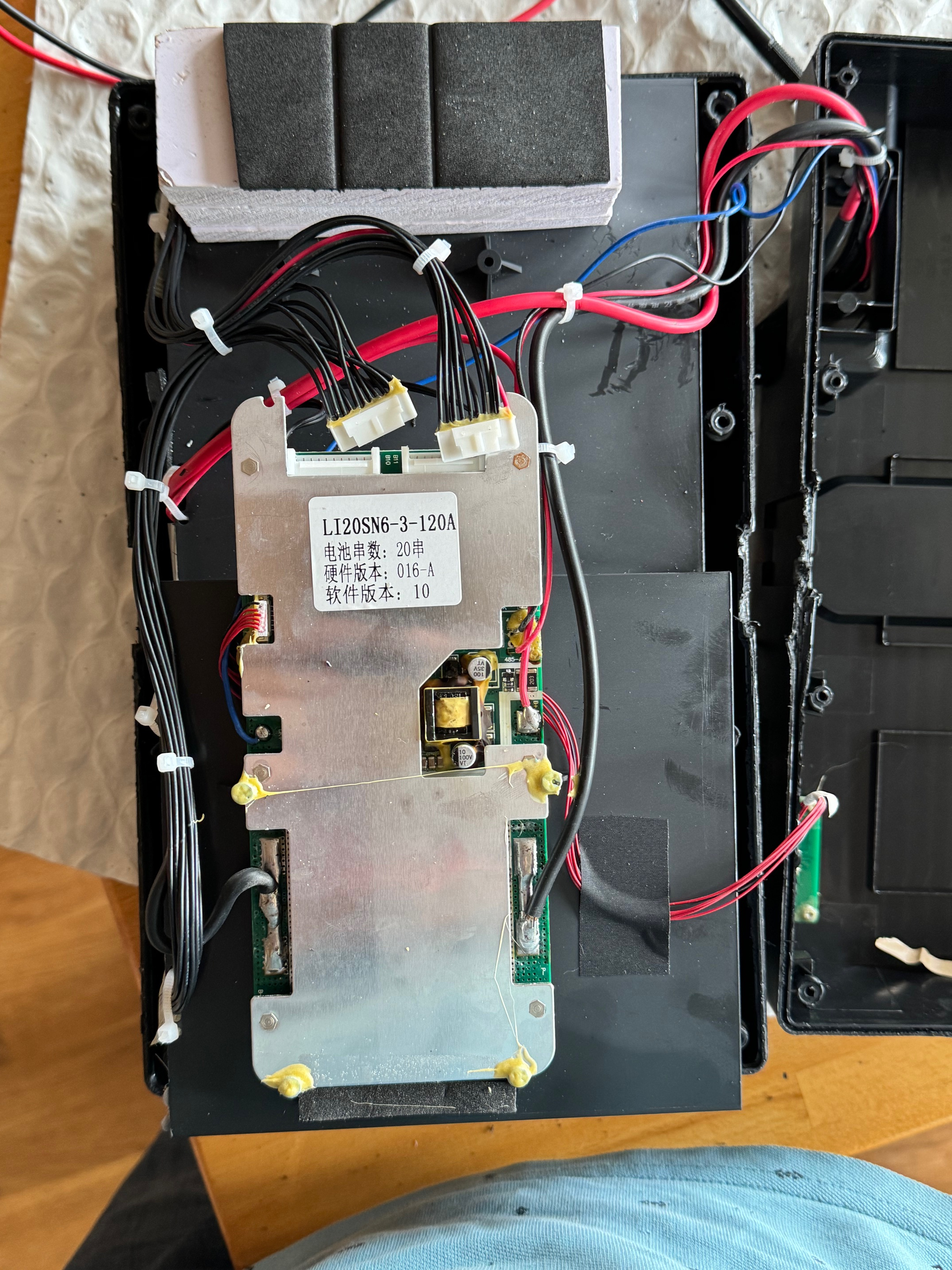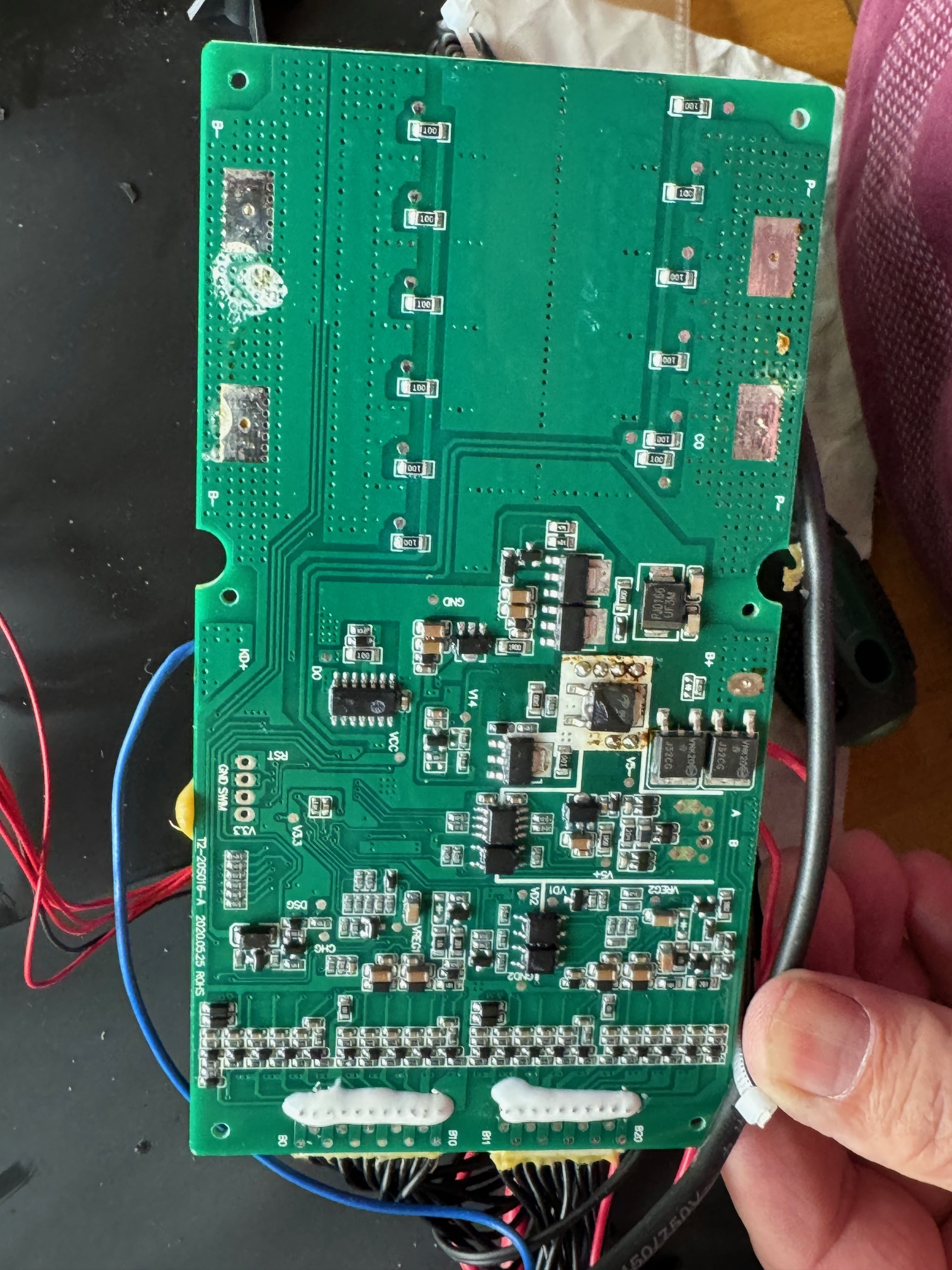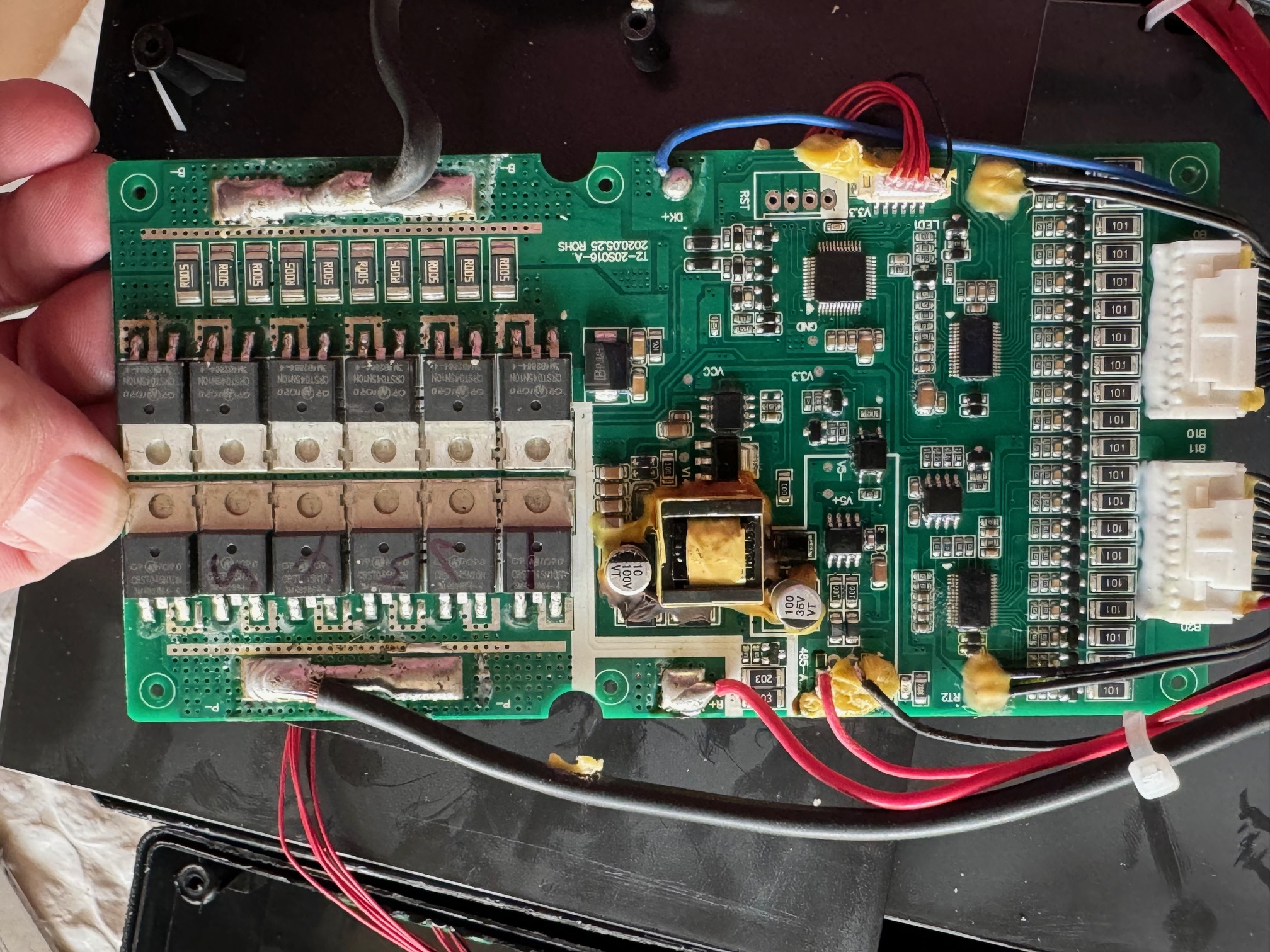 Hallo Gelegenheitsrollerfahrer und SpidiG, ich habe exakt das gleiche Problem. Ich lade über den Robo S beide Akkus auf voll. Die Anzeigen auf den Akkus zeigen jeweils beide voll an. Das Fahr-Display zeigt mit aber an, dass der hintere Akku bei 0% ist und zeigt das Symbol der Zapfsäule. Wenn ich fahre kann ich manchmal 50 km/h fahren, machmal geht auch 80 km/h. Sollte der Roller nur 50km/h fahren so schalte ich den Roller während der Fahrt kurz aus, und dann wieder an, dann hat er wieder die Power für 80 km/h. Komisch! Die gemessene Spannung an den Akkus war beide male 80,9 Volt. Wenn ich die Akkus umstecke wandert der Fehler machmal mit und manchmal auch nicht. In der Mehrheit wandert der Fehler aber mit. So entschied ich mich den betroffenen Akku zu öffnen. Eine mutige Entscheidung, denn bis das schwarze Gehäuse offen war dauerte es min. 30 Minuten und ich hatte Sorge es zu beschädigen. Als es dann offen war konnte ich dann eine erste Fehlersuche durchführen. Kein Kabelbruch, keine offensichtlich verschmorte Platine, einfach nichts zu entdecken. Auf der BMS-Platine befindet sich eine grüne LED die leuchtet sobald ich am BMS die Ballancerkabel abgezogen hatte. Also findet eine aktive Überwachung der Zellen statt. Nachdem ich die Ballancerkabel wieder eingesteckt hatte ging die LED nach einer zeit von ca. 1 Minute wieder aus. Das zeigt mir das der Selbsttest wohl auch i.O ist. Also schraubte ich vorsichtig die BMS-Platine lose und schaute auf die Rückseite der Platine, die auch dort mit SMD-Bauteile bestückt war. Auch sah ich die Leistungstransistoren (MOS-FETs). Alles so weit augenscheinlich i.O. Als nächstes schaute ich mir die Balancen-Kabel an und hatte die einzelnen Ballanceranschlüsse gegen Null gemessen. Es startete mit 4,04 Volt, dann ging es weiter mit 8,08V; 12,13V; 16,17V; 20,21V; 28,2V; 32,3 V; 36,3V; 40,3 V; 44,3 V; 48,4 V; 52,4V; 56,5V; 60,5V; 64,5V, 68,6V; 72,6 V;76,6V; und 80,7V.