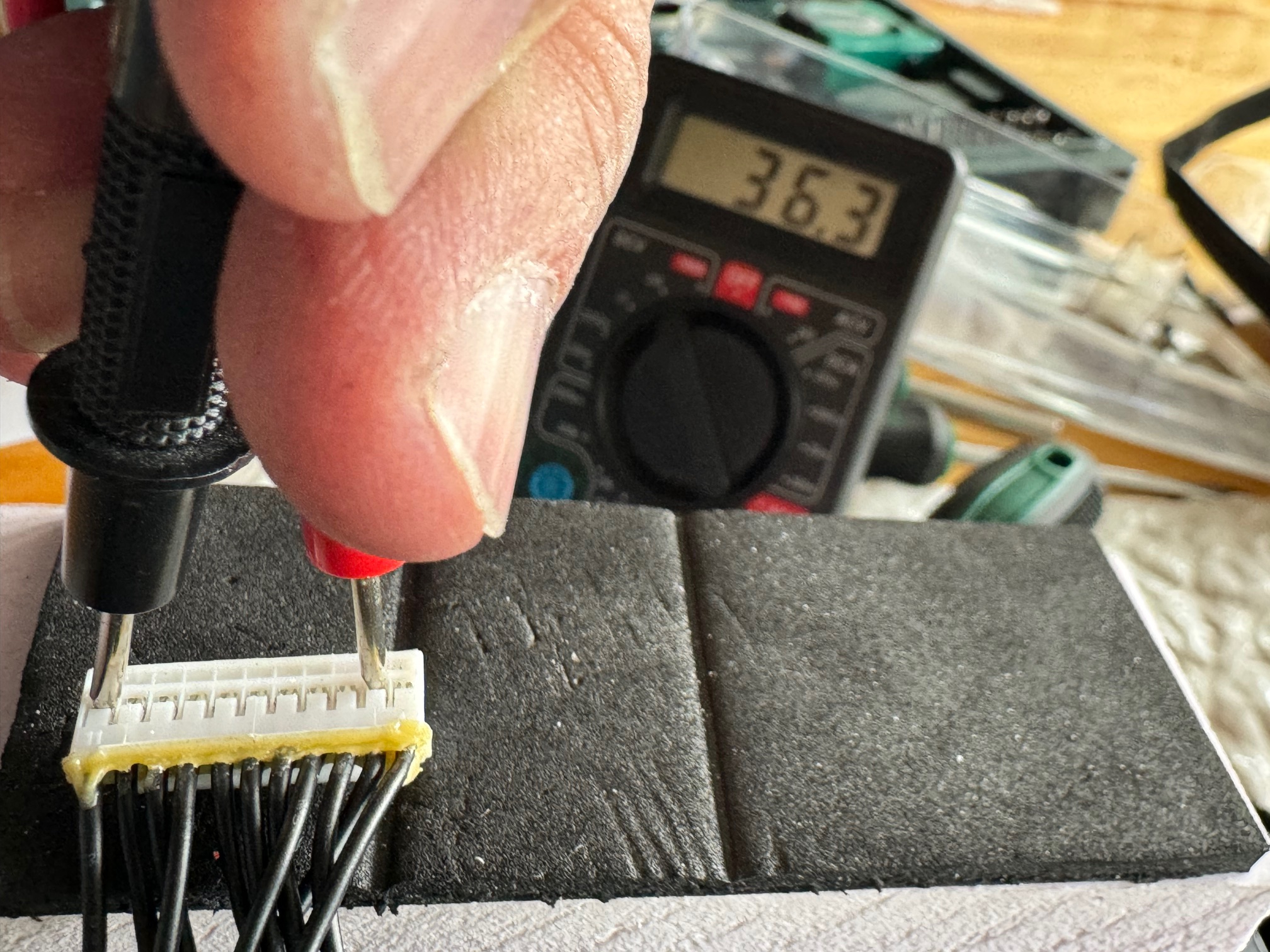 Diese 20 Messwerte ergaben dann nach einer Berechnung des Mittelwertes also 8,08V/2 = 4,04V, 12,13V/3 = 4,04V etc..... ich erspare euch die Aufzählung.... schlußfolgernd ergab es als Maximalwert 4,04V und als Minimalwert 4,02V. Ich denke mal von der Spannung sind die Zellen so weit i.O. Leider habe ich kein Messgerät um Innenwiederstände im Milli-Ohm Bereich zu messen und mußte mir eingestehen, dass ich am Akku keinen Fehler gefunden habe. Als nächstes habe ich alle Kabel auf Durchgang gemessen und erneut kein Fehler gefunden und schraubte den Akku wieder zu. Also muß der Fehler doch wo anders liegen. Ich mutmaße dass die Akkustecker mit den 3 Anschlüssen für das RS 485 Bus-System das Problem sein könnten. Leider sind die Stecker nirgend zu bekommen, es stellt sich die Frage ob ich eine komplett neue Steckverbindung vom Akku zur Anschlusskabel mir einbaue, da ich die Signale des RS 485 Bus weder messen noch verfolgen kann. Allerdings ergab meine Recherche dass das Bussystem einen als Master definierten Knoten hat der sendet, alle anderen angeschlossenen Knoten erhalten dann die Daten über die RS 485-Ports. Abhängig von den gesendeten Informationen antworten dann eben Null oder mehr Teilnehmer auf der Leitung des Masters.