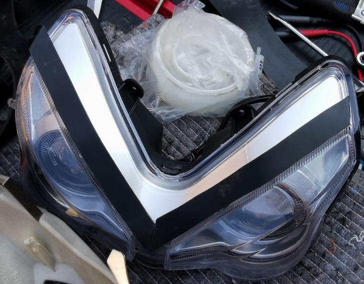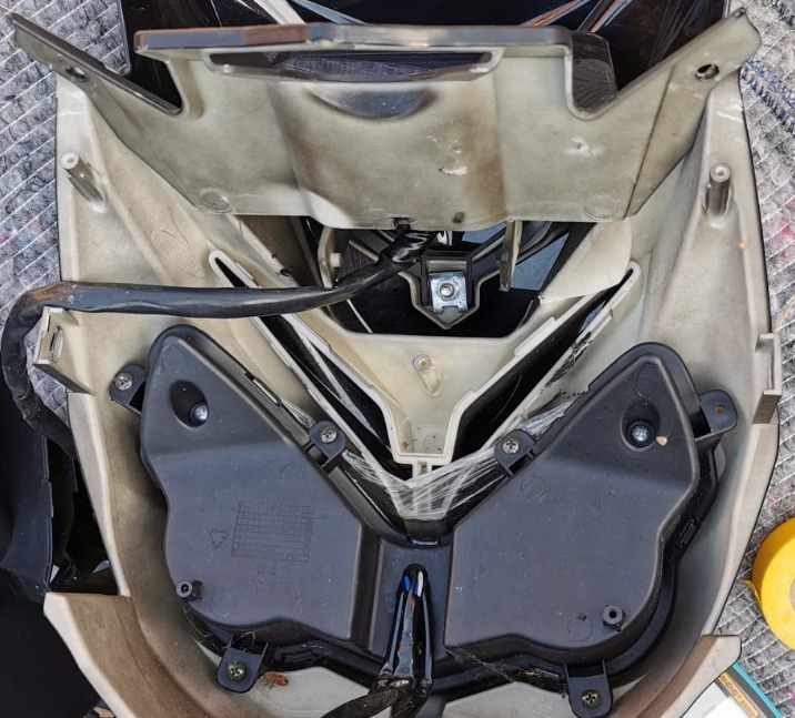 I removed the back plate from the headlight which is the part that the mounting screws go in to. This was not too difficult, but mine was broken due to some past time when the bike has fallen. I repaired it. There are two features at the top of the headlight behind the speedometer that needs a flat bladed screwdriver to carefully free.