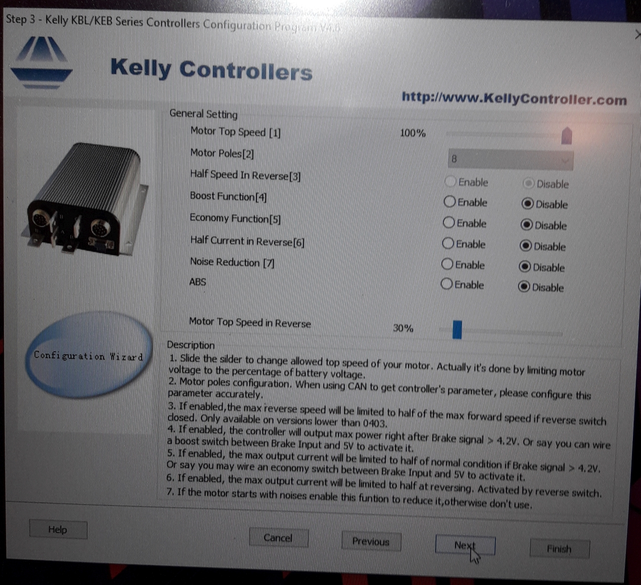 Die Software Version ist die 406 für KEB, anbei Bilder. Sehr ungewöhnlich finde ich, dass die Polpaare auf Seite 3 falsch eingestellt und ausgegraut sind. Aber Kelly sagt, die werden nur zur Drehzahlermittlung mit CAN Modellen benutzt und man soll sich keinen Kopf machen. Auf Seite 4 ist dann unten "Smooth". Rev check habe ich noch nicht verstanden, Auto identify wenn man das aktiviert taktet er alle drei Phasen beim Start durch. Bei mir hat er immer rot angezeigt und scheint nicht glücklich, jemand anders aus dem Internet hatte immer grün und war auch nicht zufrieden.
