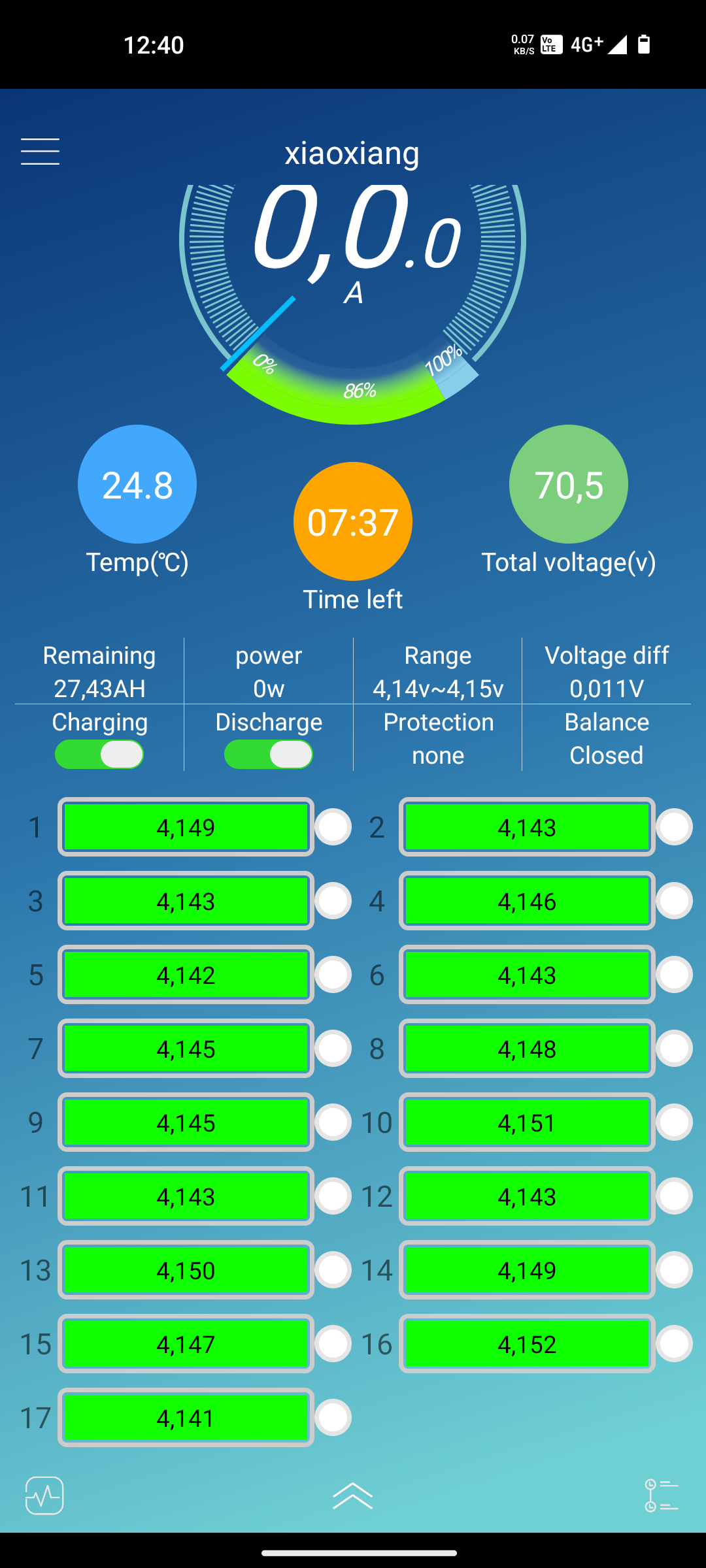 Das Ladegerät schaltet zu früh ab, sodass der Akku immer nur bis 87-91% geladen wird, was dann laut Xiaoxiang App ca. 4.15V pro Zelle entspricht.