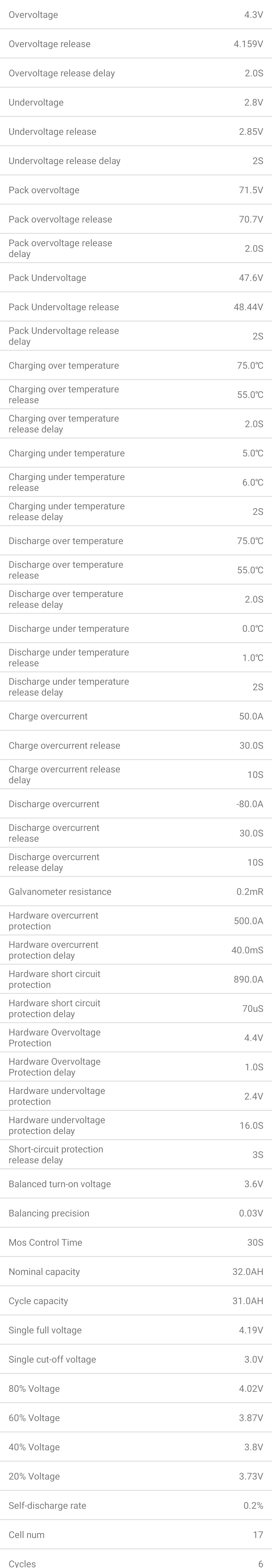 ich würde zunächst einmal nachmessen (mit einem guten Spannungsmessgerät), ob es Differenzen zwischen der Zellspannung eines Blocks gemäß BMS und Messgerät gibt. Da geht natürlich auch mit der Gesamtspannung. Gibt es Abweichungen zwischen Volt des BMS und des Messgerätes? Beim JK BMS kann man das BMS in den Einstellungen sogar kalibrieren. Ich denke mal, das geht bei Deinem nicht, folglich muss man die Werte entsprechend der Abweichung anpassen. Beim überfliegen Deiner Werte würde ich die Under- und Overvoltage mal anpassen. Die Werte scheinen mir beides etwas zu hoch zu sein, mit 4,3 und 2,8V auf 4,2 und 2,55V z.b.