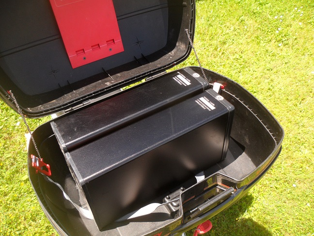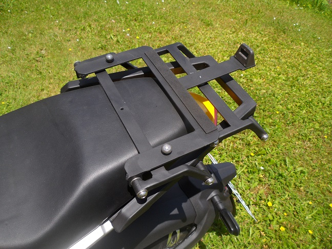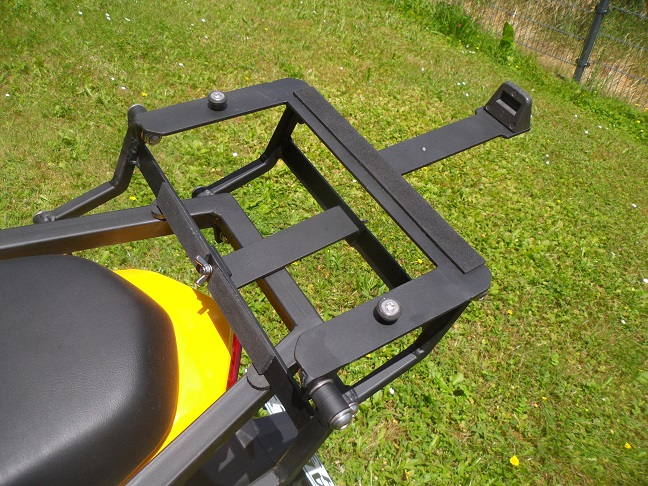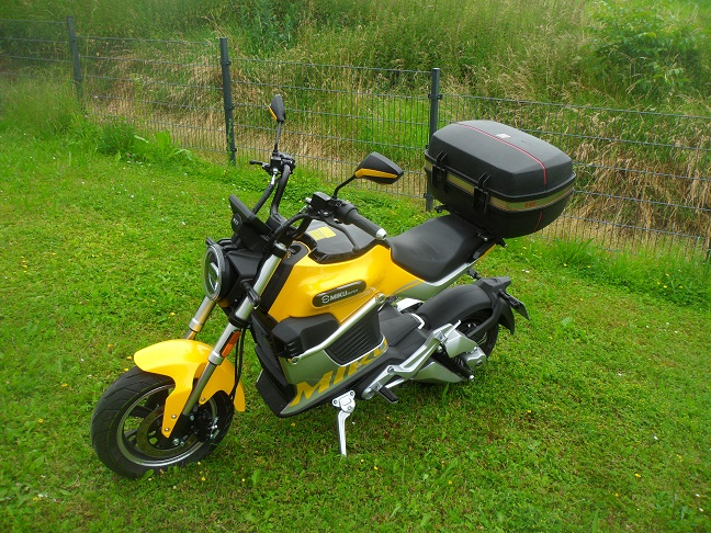 da mir das Gepäckfach der Super Miku für verschiedene Vorhaben einfach zu klein erschien, habe ich mich mal an den Bau eines (klappbaren) Topcase Trägers für einen meiner vorhandenen E45 Givi Monokey Koffer gemacht. Da passen u.a. auch zwei Intergralhelme rein wenn man die bei Aufenthalten micht mitschleppen möchte oder auch ein zweiter Akkusatz sofern man denn einen hat und mal die Reichweite verdoppeln möchte. Letzteres ist aber aufgrund des Gewicht der Akkus nicht zu empfehlen wenn der Topcaseträger für das Fahren zu zweit in die hintere Position geklappt ist denn selbst wenn der Halter das verkraften würde, wären die 4 Original M8er Innengewinde am Fahrzeugrahmen wohl überfordert. Bei Solobetrieb dagegen liegt das Gewicht des Topcases zu etwa der Häfte auf dem hinteren Teil der Sitzbank auf und die Gesamtkostruktion muss das ganze hauptsächlich in Position halten. Für die hintere Position wird der Halter noch durch Anschrauben eines Z-förmigen Flacheisenprofils stabilisiert was für leichtere Beladung ausreichen sollte. Für die vordere Position muss ich mir noch eine einfache Arretierung überlegen, denn die Federung der Super Miku ist ja relativ hart und von daher braucht es da noch eine Optimierung. Wenn ich mir mal sicher bin dass ich nichts mehr trennen muss werde ich, um das ganze Diebstahlicher zu machen die M8er Schrauben die als Gelenke dienen und aktuell noch mit Stoppmuttern gesichert sind wohl mit hochfester Schraubensicherung verkleben oder anders unlösbar zu machen. Bei abgenommener Sitzbank lässt sich der ganze Halter aber durch abschrauben der 4 M8er Originalschrauben (ich habe die allerdings durch 10.9er Qualität ersetzt) einfach vom Fahrzeug abnehmen. Optisch ist das ganze wohl nicht das Highlight, aber dafür praktisch. Kann man natürlich auch für andere Koffer- bzw. Topcase- Trägersysteme anpassen. Vielleicht kann ja der eine oder andere die Idee weiterverwenden. Wenn ja, viel Spass dabei. P.S. Das Auf- und Ab- steigen muss man bei der vorderen Position etwas üben, am einfachsten geht das wenn man so tut als wollte man nicht auf den Sitz sondern auf die Tankatrappe aufsteigen.