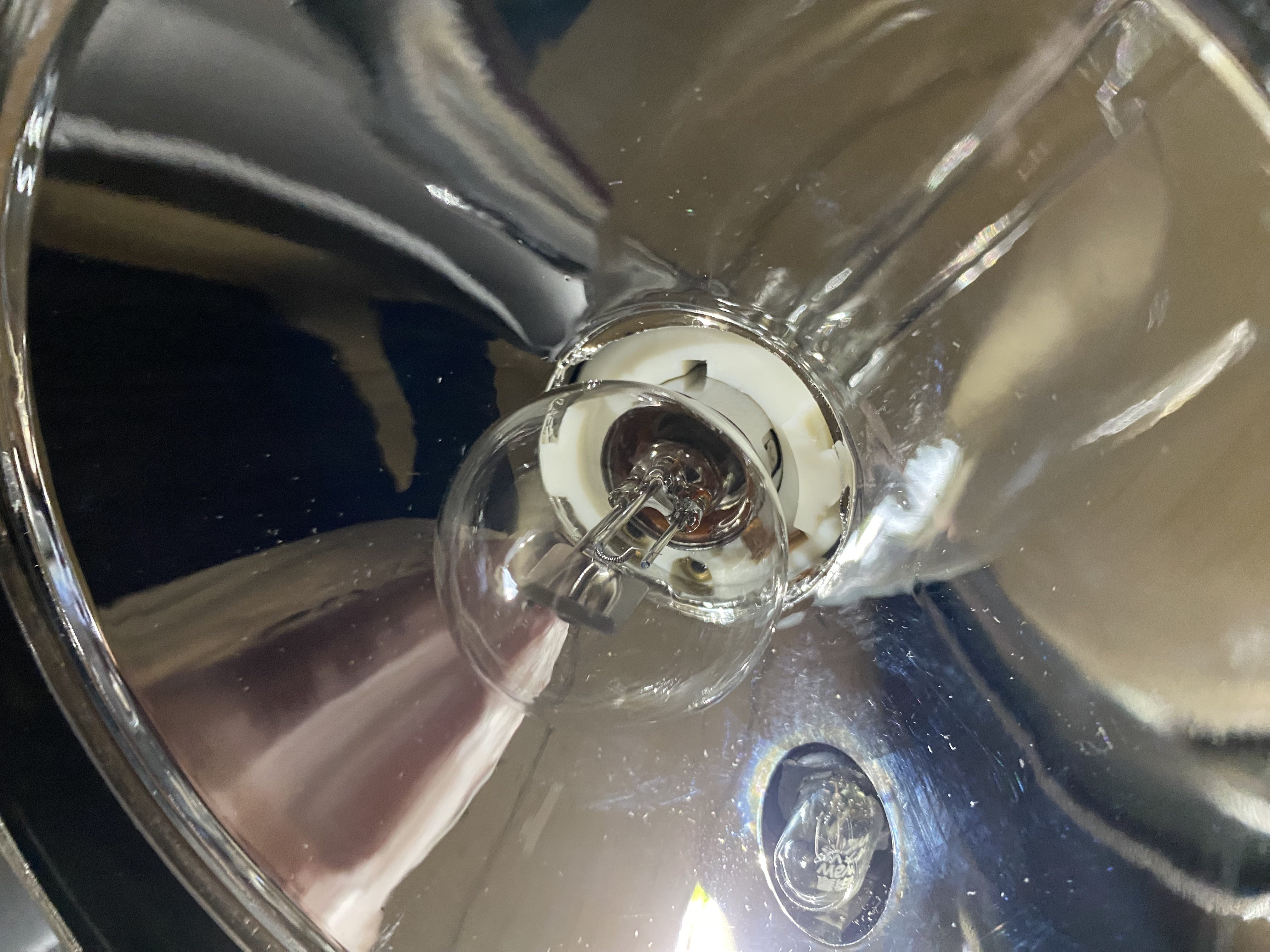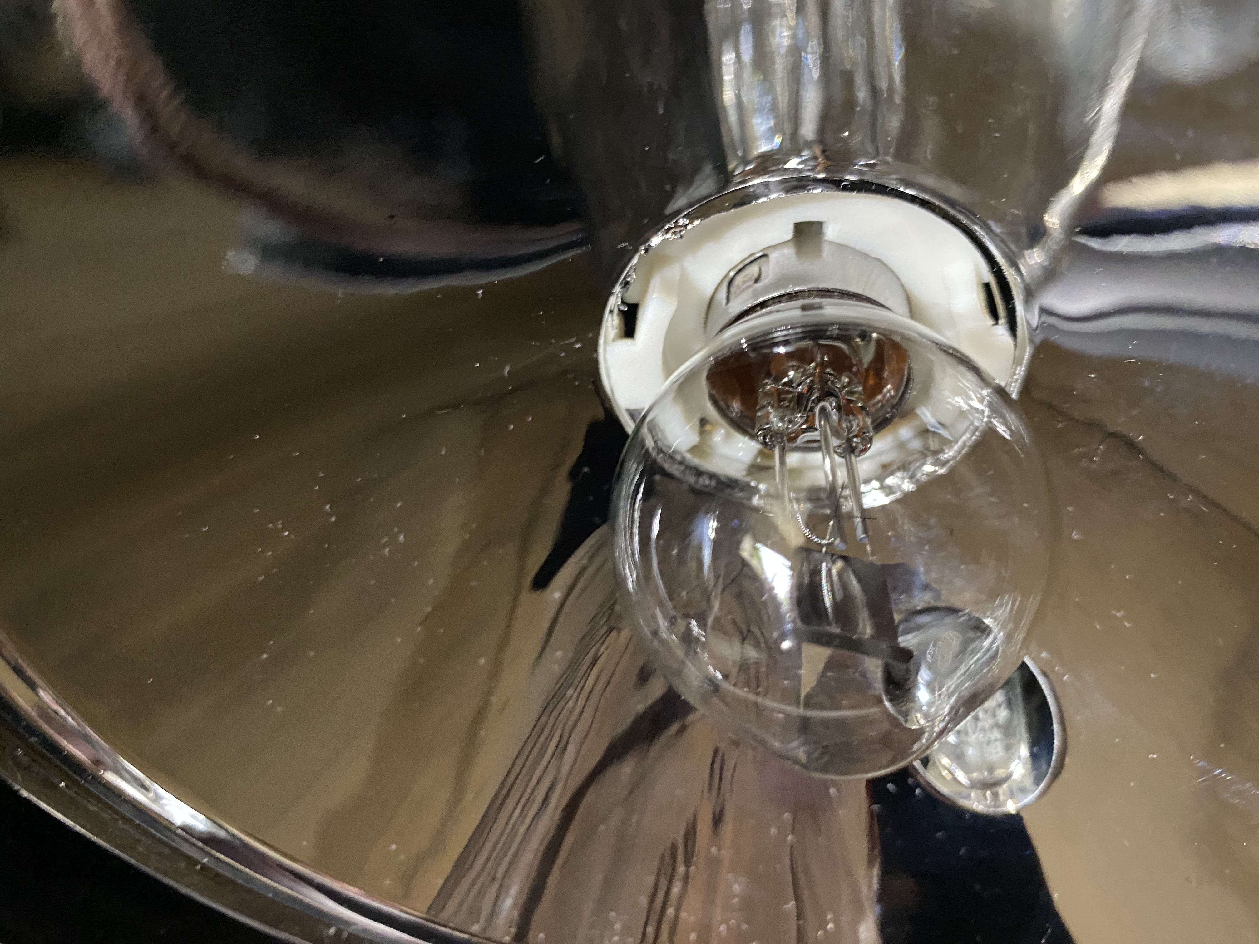 Meine Frage nun: Kennt jemand diesen Lampensockel (siehe Foto) und kann mir sagen, wie die Glühbirne dort befestigt ist? Muss vielleicht auch der Reflektor entfernt werden, weil die Birne auf dessen Rückseite mittels eines Bügels o.ö. (wie bei manchen Autos) befestigt ist?