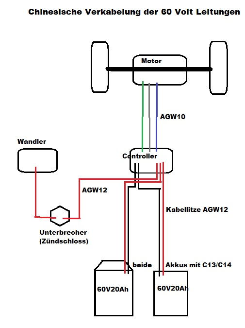 Und der Strom fließt direkt in den Controller und auch in den Motor (wie man auf der Zeichnung erkennen kann). Das Zündschloss verbindet lediglich den Controller mit dem 12V-Wandler.