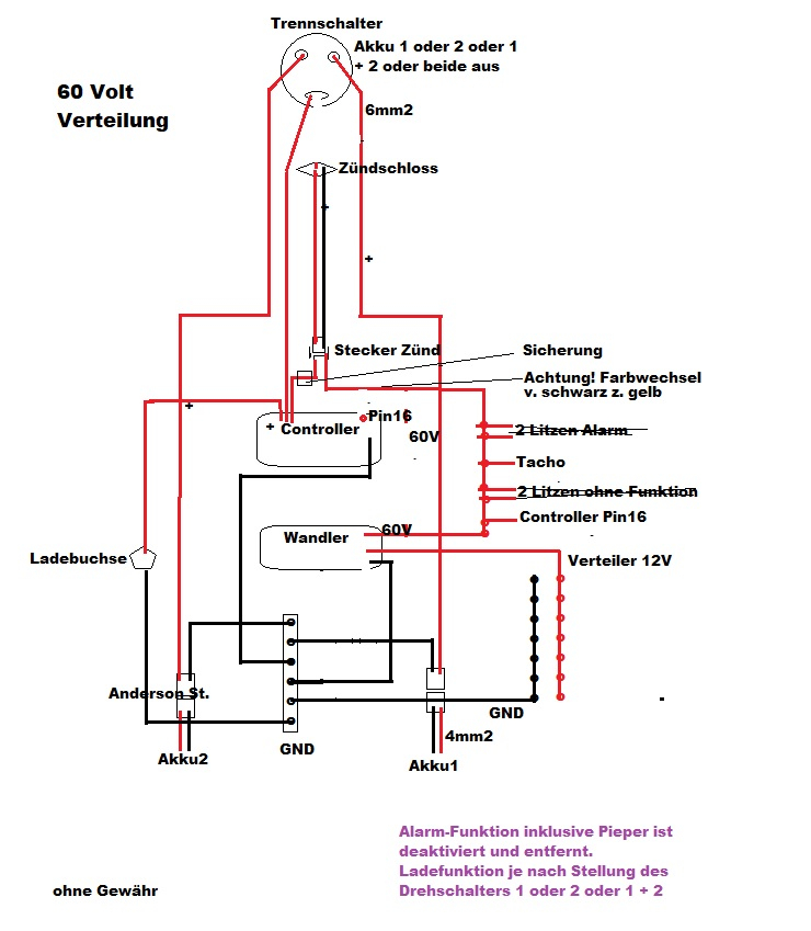 Anfrage bei Mr. Wu (Shansu) verlief ergebnislos, aber zumindest ergatterte ich auf diesem Weg einen Anschlussplan des Controllers. Darin war – obwohl überwiegend in chinesisch beschrieben – ersichtlich, dass die gesamte Alarmfunktion mit samt Kabel ohne Beeinträchtigung des Fahrbetriebes entfernt werden konnte. Ich brauche auch keine Alarmanlage und auf das ewige Piepen kann ich auch gerne verzichten.