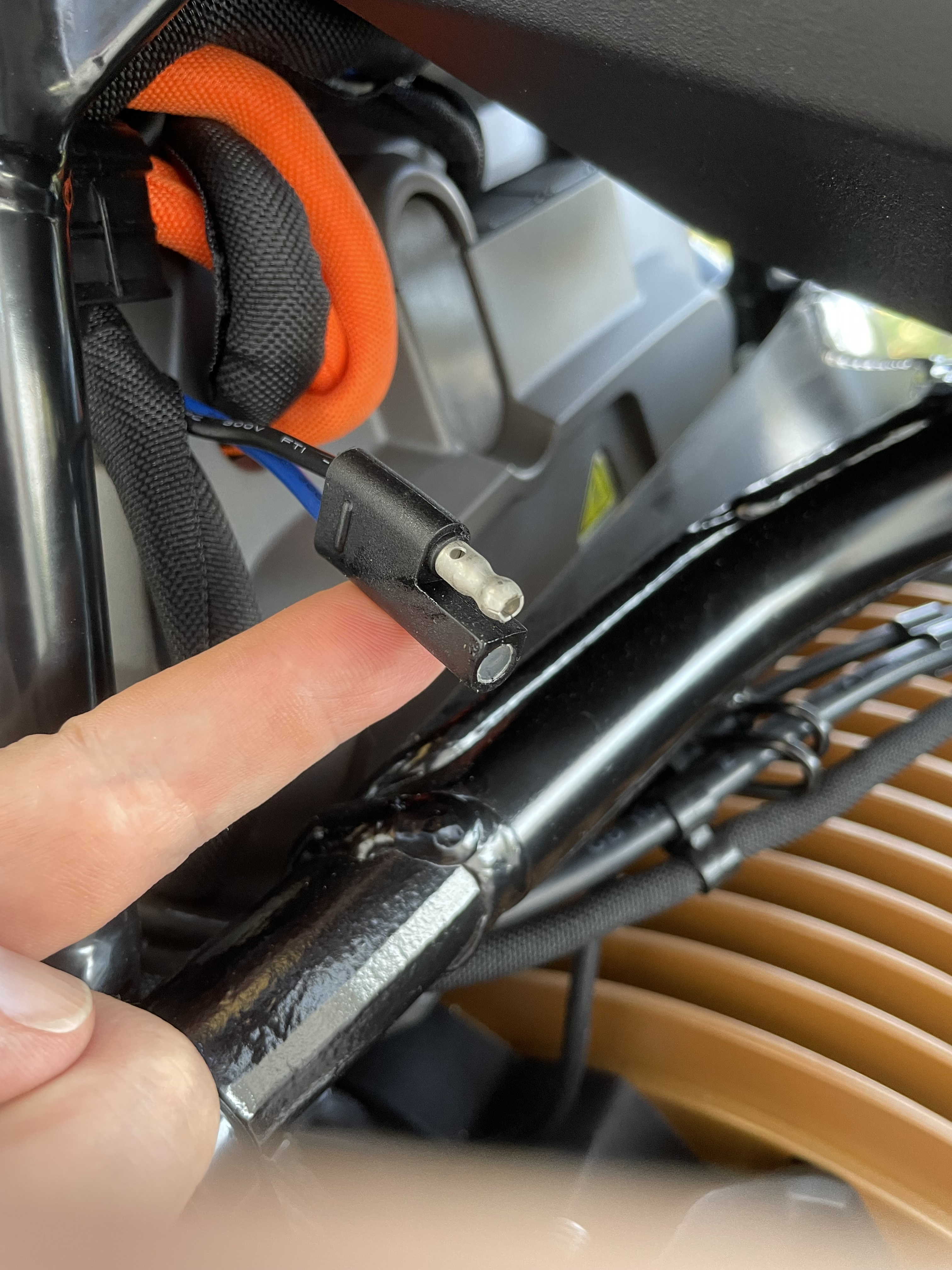 Das ist ein SAE-Stecker mit 12V für Accessoires, der Strom führt, wenn das Moped eingeschaltet ist. Erwähnt wird er auf Seite 6.36 Deiner Bedienungsanleitung. Frag doch mal den Händler, ob da eine Schutzkappe drauf gehört.