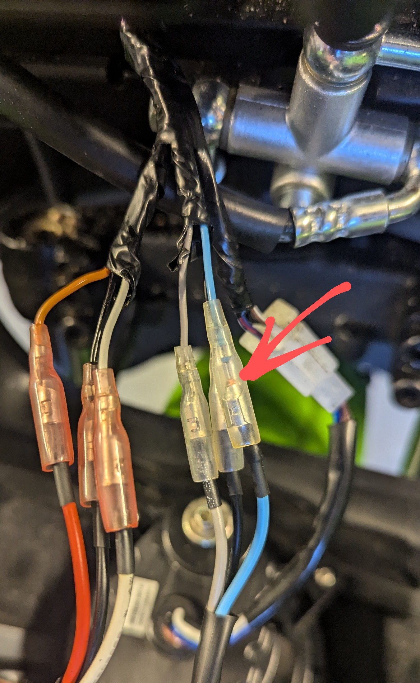 Wenn ich den linken vorderen Blinker diskonnektiere (blaues Kabel (mit rotem Pfeil markiert), fängt der linke hintere Blinker auf einmal wieder an zu blinken (allerdings mit doppelter Frequenz).