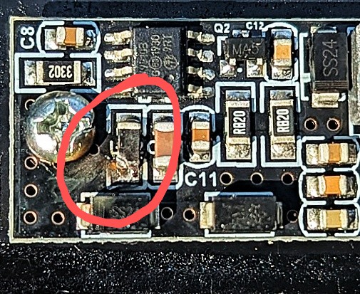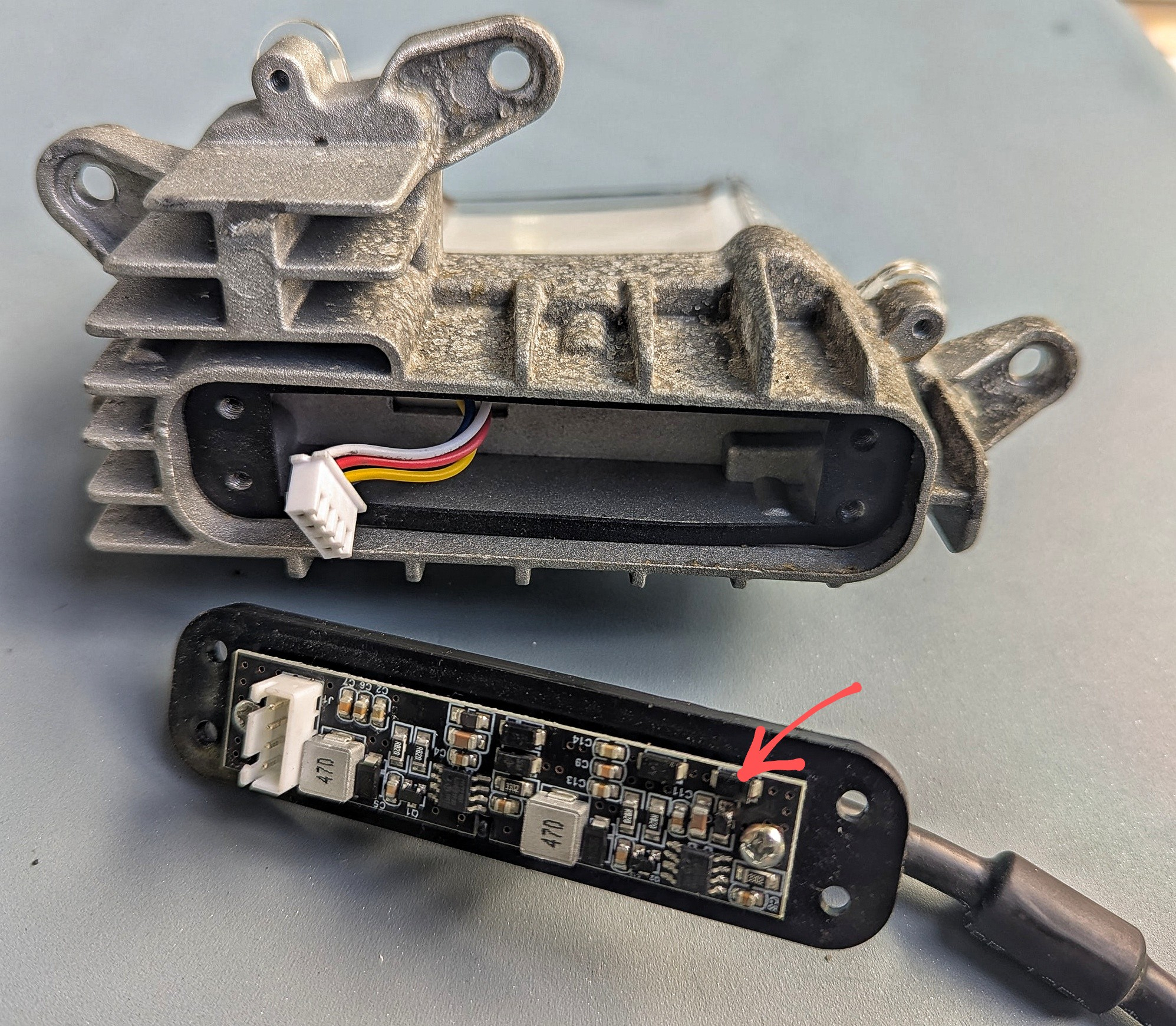 habe eben die Tagfahrlicht-/Blinkereinheit zerlegt. Das Milchglas-L ist auf dem Aluminiumhalter/Kühlkörper mit 4 Schrauben fixiert. Allerdings sind das Kunstoffmilchglas und der Aluträger zusätzlich rundherum miteinander verklebt, um Nässeeindringen zu verhindern. Auf der Rückseite (wo die drei Kabel herauskommen) ist der Kunstoffträger für die Steuerplatine ebenfalls mit 4 Schrauben mit dem Aluträger verschraubt - hier gibt es dann nur eine eingelegte Gummidichtung als Schutz gegen Feuchtigkeit. Die Platine ist mit einem dünnen weißen 4-Fachstecker mit den LED's verbunden, diesen kann man abziehen. Beim genauen Betrachten der Platine habe ich dann an dem einen Ende neben einer weiteren Befestigungsschraube wirklich Korrosionsspuren und einen deformierten/halb abgerauchten rechteckigen Kondensator (oder was auch immer das ist) gefunden. Ich habe dann zum Testen noch einmal 12V Spannung an die Hauptkabel gelegt, nachdem ich den weißen Diodenstecker wieder mit der Platine verbunden habe und siehe da: Tagfahrlicht funktioniert, beim Blinkeranschluß raucht es gleich an der besagten Stelle. Ich habe dann alles fein gesäubert und frisch an der verschmokelten Stelle nachgelötet - hat leider nichts gebracht