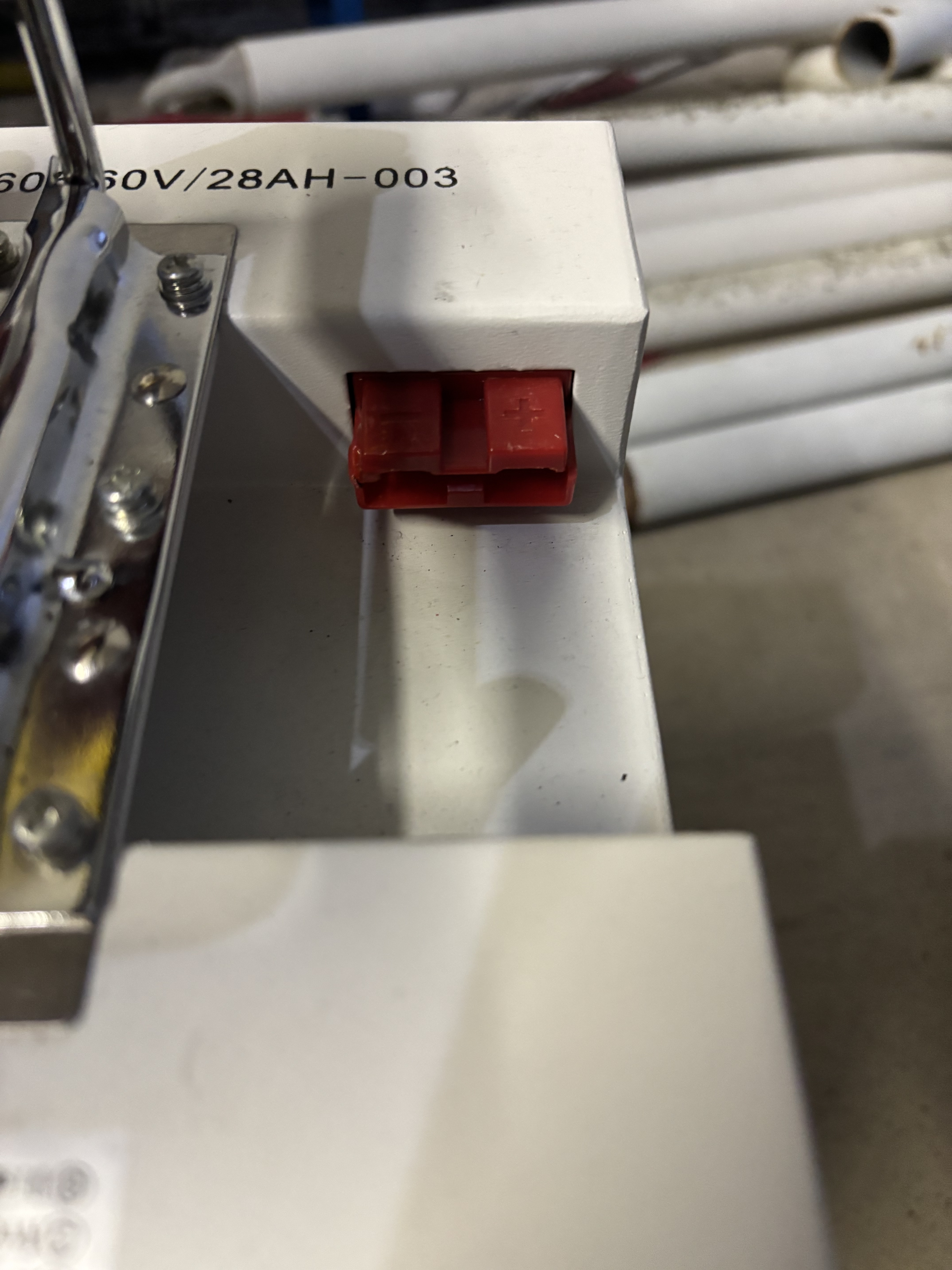 der Rote Hochtstrom-Stecker ist ein Anderson SB50 (50 Ampère Belastbarkeit) der nur den Plus und den Minus-Pol hat. Das macht es natürlich einfach, da jeder 60Volt-Akku mit Anderson SB50-Stecker so an den Roller angeschlossen werden kann. Die verschiedenen Farben bei der Steckverbindung haben allerdings Kunststoff-Nasen so eingegossen, dass nur zwei Rote-Stecker (verdreht) ineinander passen oder zwei Graue oder sonstige Farben als Paar. Diese Sperren kann man aber abfeilen. Dann passt alles ineinander (immer der zweite gleichartige Stecker verdreht in den Anderen).