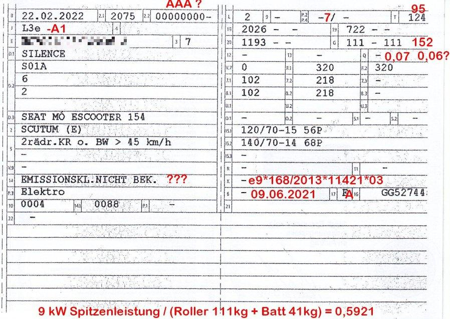 So jetzt meine Fragen, bei der Zulassung des Rollers konnte der Hersteller, HSN 2.2 AAA , nicht eingetragen werden da unter 17 ein E, für Einzelabnahme, steht, als HSN 00000. TSN ist 2075. Meine COC Bescheinigung ist 2022.