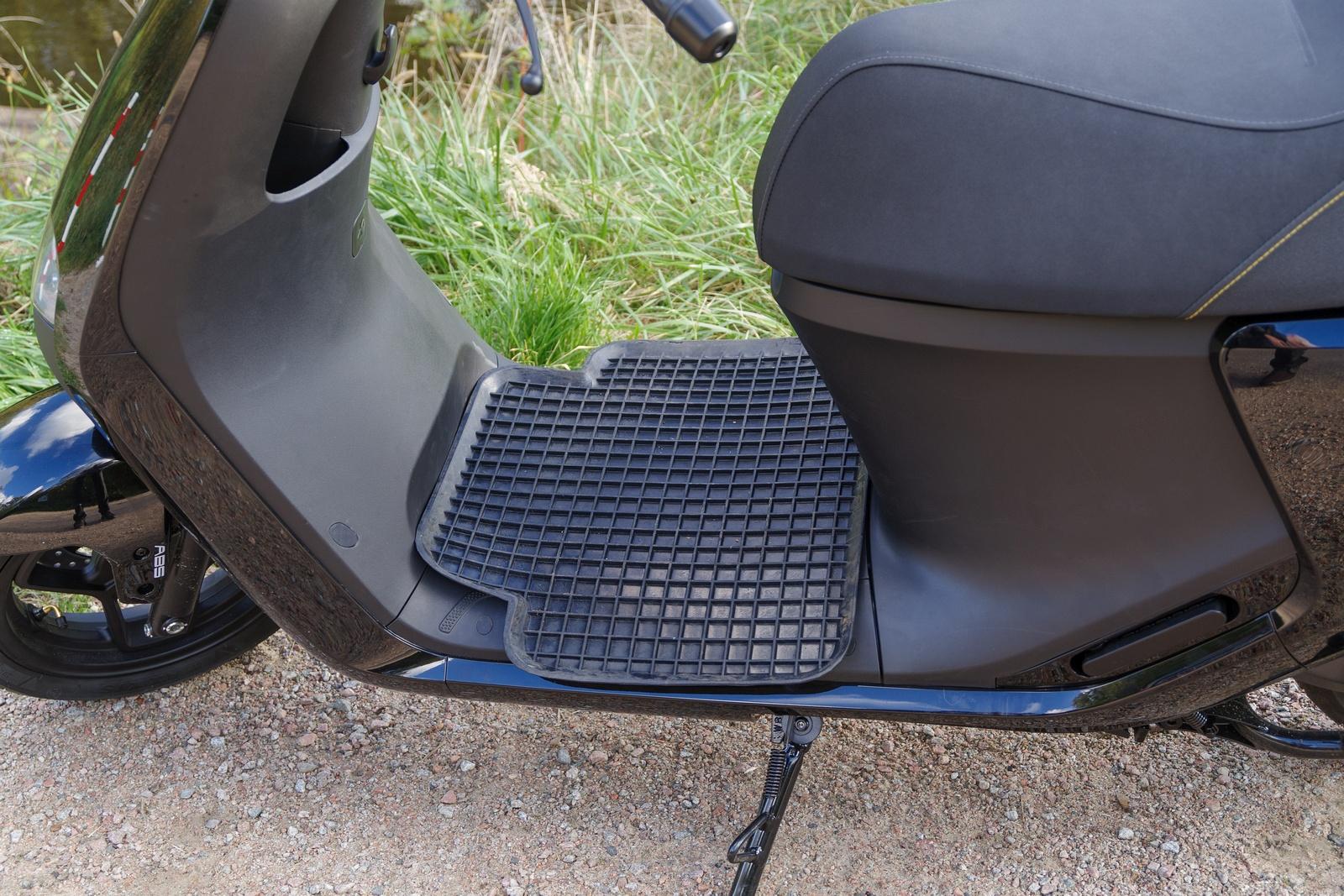 Temporär habe ich für schlappe 6,46€ eine Gummi Matte vom großen Fluss im Einsatz. Sieht so aus: Liegt ziemlich fest auf (auch wenn es nicht so aussieht), flattert nicht und der Dreck meiner schmutzigen Schuhe vom Stall tangiert den Roller nicht mehr. Sie passt erfreulich gut in den Ausschnitt an der Fußspitze sowie an den Sitzdom, so dass sie auch nicht rutscht.