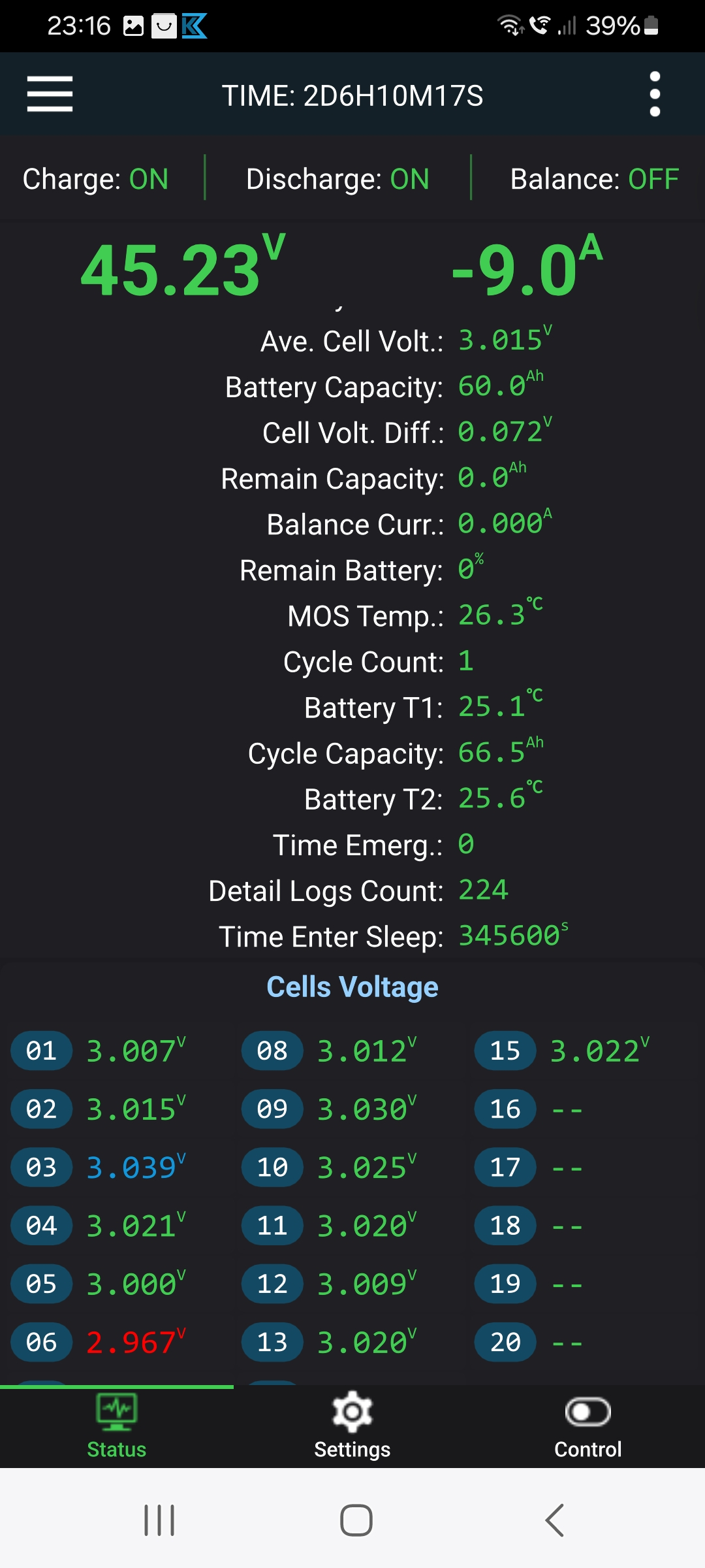 In zwei Tagen hat das frisch verbaute aktive JK-BMS die Zellen mit 0,6A Balancerstrom angeglichen.