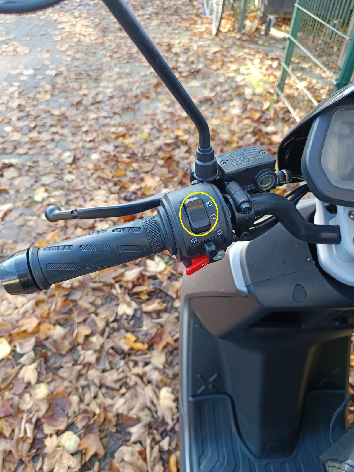 Der gelb eingekreiste Schalter ist der für Dauerfernlicht. Bodo 1800 meint die kleine Wippe, die man mit dem linken Zeigefinger quasi zwischen Haltegriff und Bremshebel bedient.