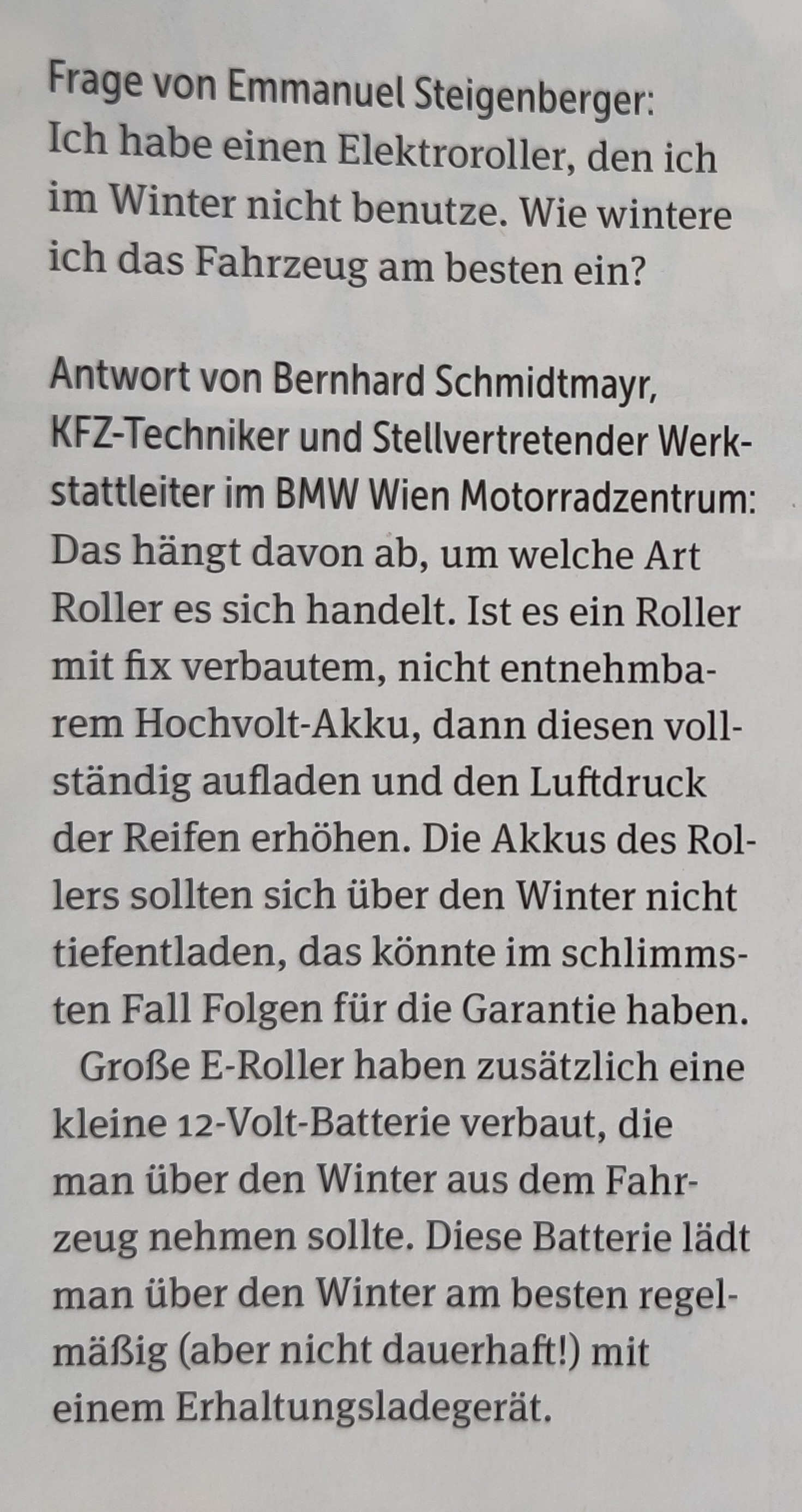 Wenn man Erfahrung hat, wieviel Energie die Roller-Elektronik und die Akku-Überwachung des jeweiligen BMS je Monat verbraucht, mag man im Herbst dann vielleicht einen 70% Ladezustand anstreben, der im April noch nicht unter 40% abgefallen ist. Ohne die Erfahrung würde ich jedenfalls auch Volladen im Herbst empfehlen.