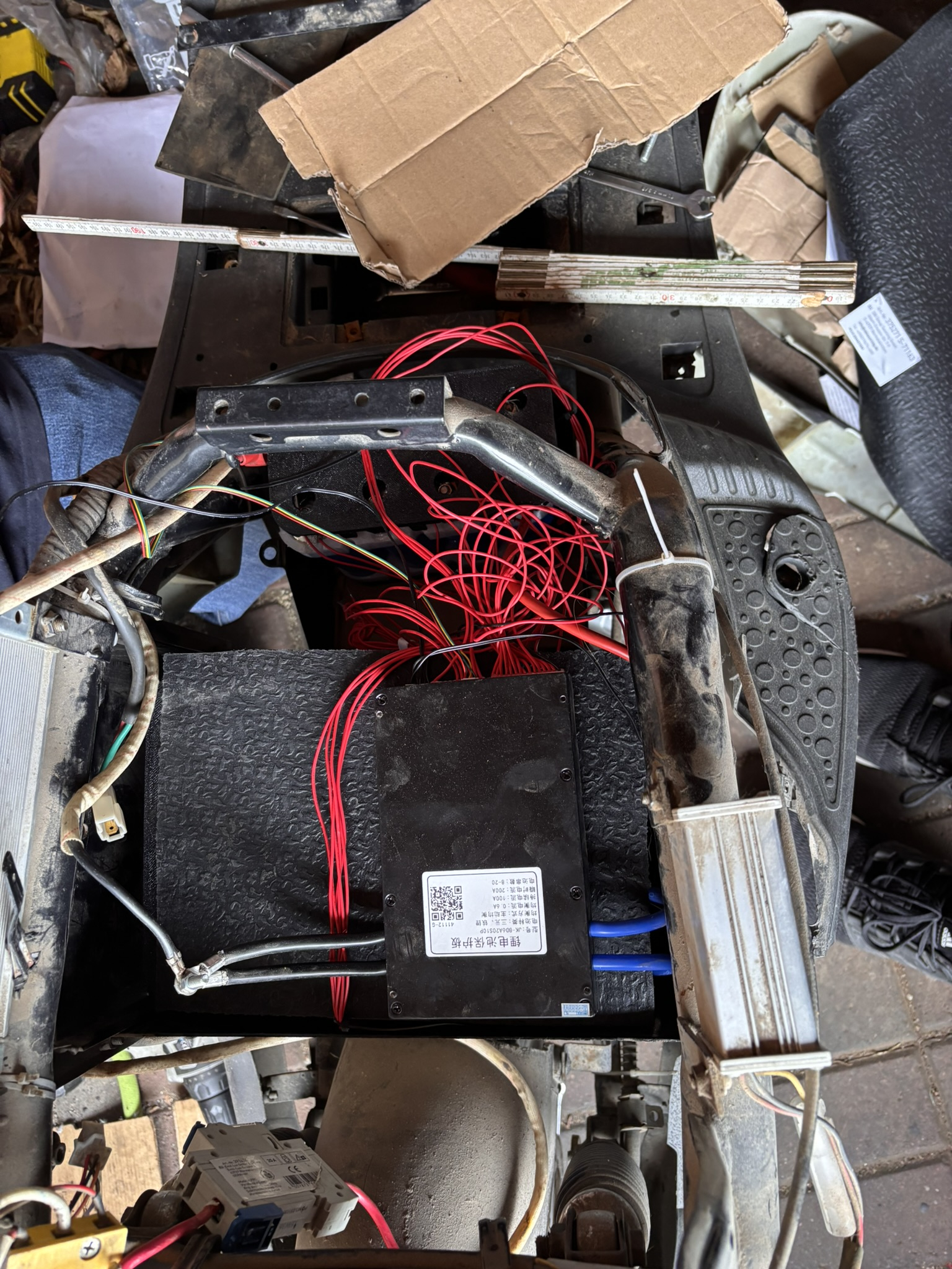 Allzu viele Fotos habe ich nicht, aber ein paar. Hier sieht man die ganze Batterie, zwei Packs: einen für das große mittlere Fach und einen für das kleine unten im Roller. Die Batteriehalter habe ich 3D-gedruckt und auch die Deckel, die danach draufgesteckt wurden (habe leider kein Foto davon, im nächsten Bild sieht man ihn so halb auf dem Akku im unteren Akkupack (das schwarze Teil)). Hier sieht man die Akkus im Roller, unten und oben mit Gummiplatten nochmal isoliert (eigentlich eine zerschnittene Fußmatte). Natürlich wurde auch daran gedacht zu schauen, dass Wasser, das in die Kästen kommt, auch abläuft. Die alten Metallbügel wurden modifiziert, sodass sie die Akkus über den Gummis nach unten drücken. Das BMS wurde mit Kabelbindern und doppelseitigem Klebeband am Gummi und Metallbügel befestigt. Die Balancerkabel wurden nochmal schön gemacht. Am Verbinder des Minuskabels wurde die Schraube gekürzt und isoliert, sowie die Seite vom BMS mit den Balancerkabeln auch nochmal isoliert.