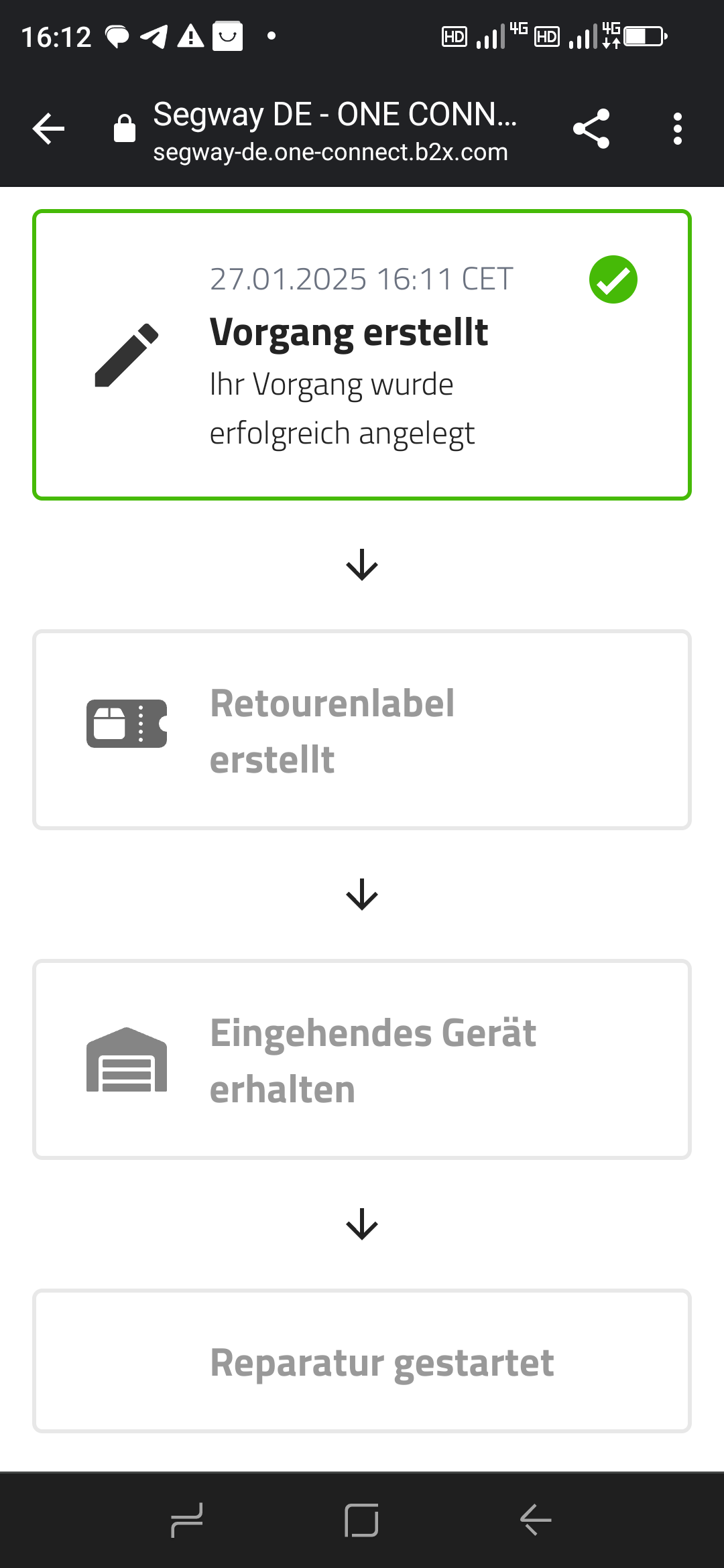 Ich hatte ein Kontaktformular ausgefüllt direkt auf der Segway-eu Seite und vorhin Antwort bekommen. Den Auftrag hatte ich dort auch eingegeben und den konnten Sie nicht finden. Also nochmal versucht, weil ich auch keinen Auftragscode bekommen hatte, und jetzt zeigt er mir an, bei Eingabe der SN: Garantieanspruch vorhanden und nix von Kosten. Ich konnte einen neuen Versandkarton anfordern und siehe da: