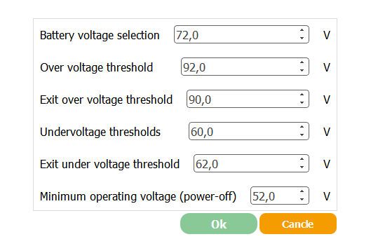 Die untere der beiden Abbildungen sind die second volt parameters und glaub ich unrelevant. bei der Ersten war meine Interpretation aus der wilden Englischübersetzung der V3 Software (bei der V5 gab es garnix sinnvolles), dass der Controller ab dieser Spannung den Strom begrenzt. Das war dann wohl nicht richtig interpretiert.