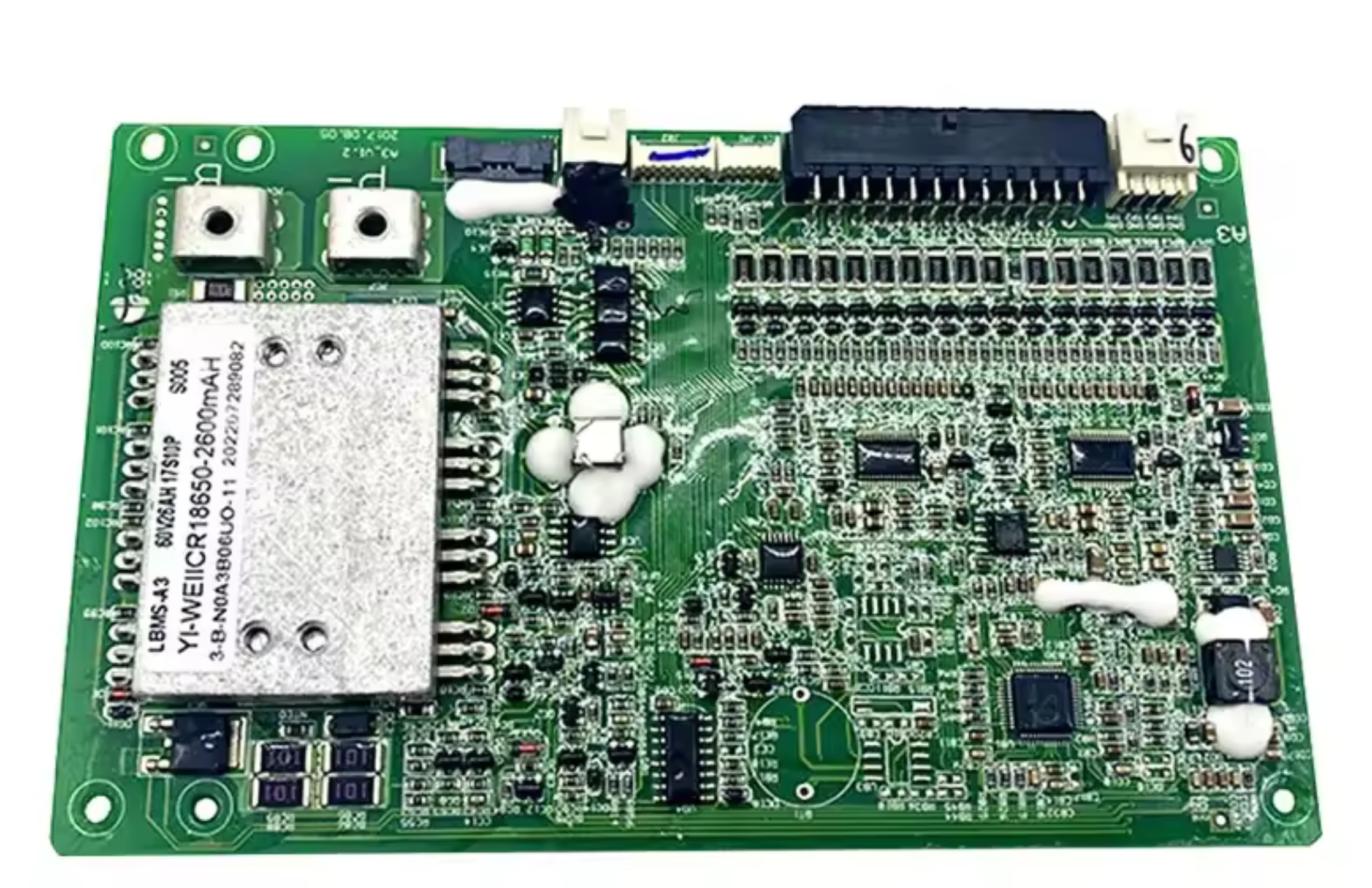 Sieht doch sehr anders aus. Sicher sind da einige Dinge auf dem Board, die nicht da sind. aber die großen Wiederstände fehlen komplett. Sorry, die sind etwas abgeschnitten im Original NIU BMS auf der linken Seite. Die sind schon fett... Es fehlt auch die Knopfbatteriezelle und die Kühlung im Balancerteil oben rechts (nehme an das ist ein Teil der Balancerunit oben rechts) Das könnte auch ein Papierstreifen sein, muss ich nochmal schauen in der Werkstatt.