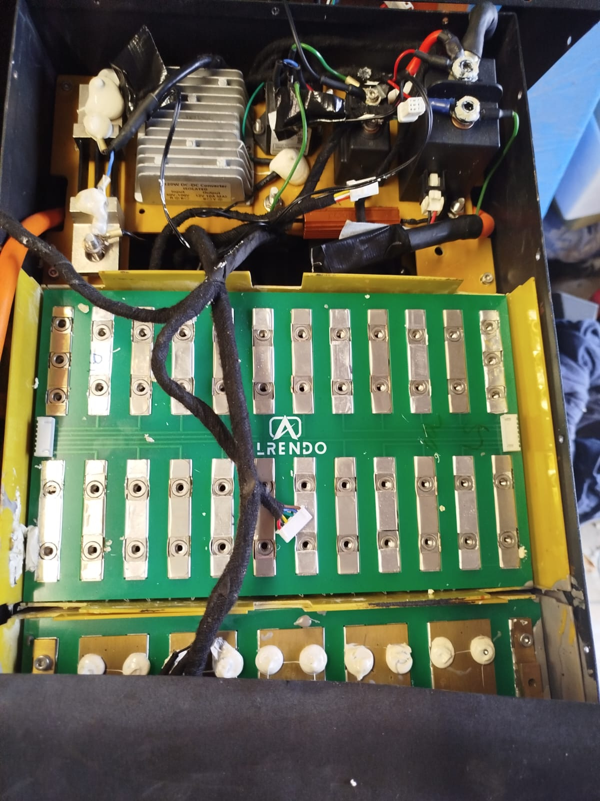 Der Akku: Der Akku besteht aus zwei Schützen, ein Relais, ein 120W DC Converter von 50-100v zu 12v, ein Shunt zu Messung des Stromes und einem BMS.