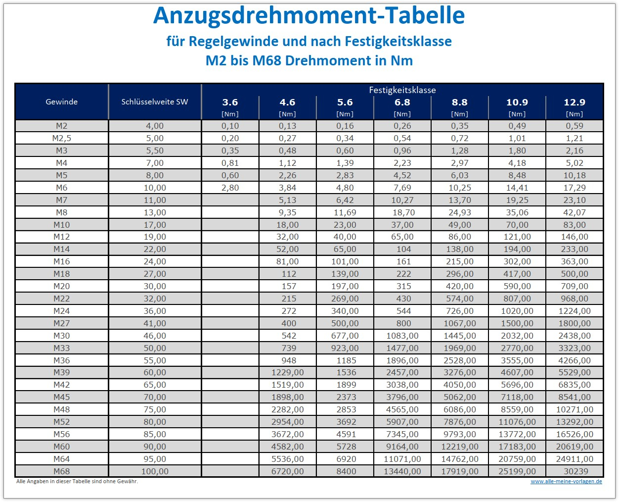 Die Angaben, in der Tabelle, sind Angaben nach DIN bzw ISO.