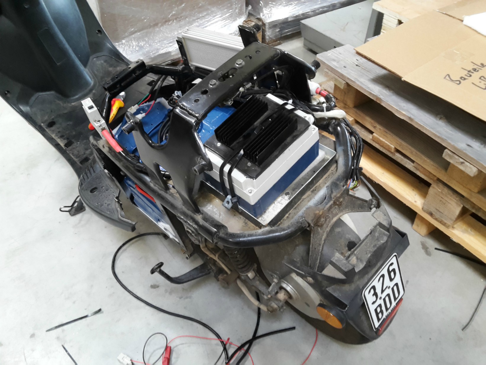 Ergänzendes: Bei der Demontage wurden auch die Werksseitigen, "hochwertigen" kabelverbindungen erneuert, die Batterieverkabelung wurde in 3 x 6mm² ausgeführt. Das "BMS Kästchen" fand auf dem hintersten Batterieplatz seine Position.