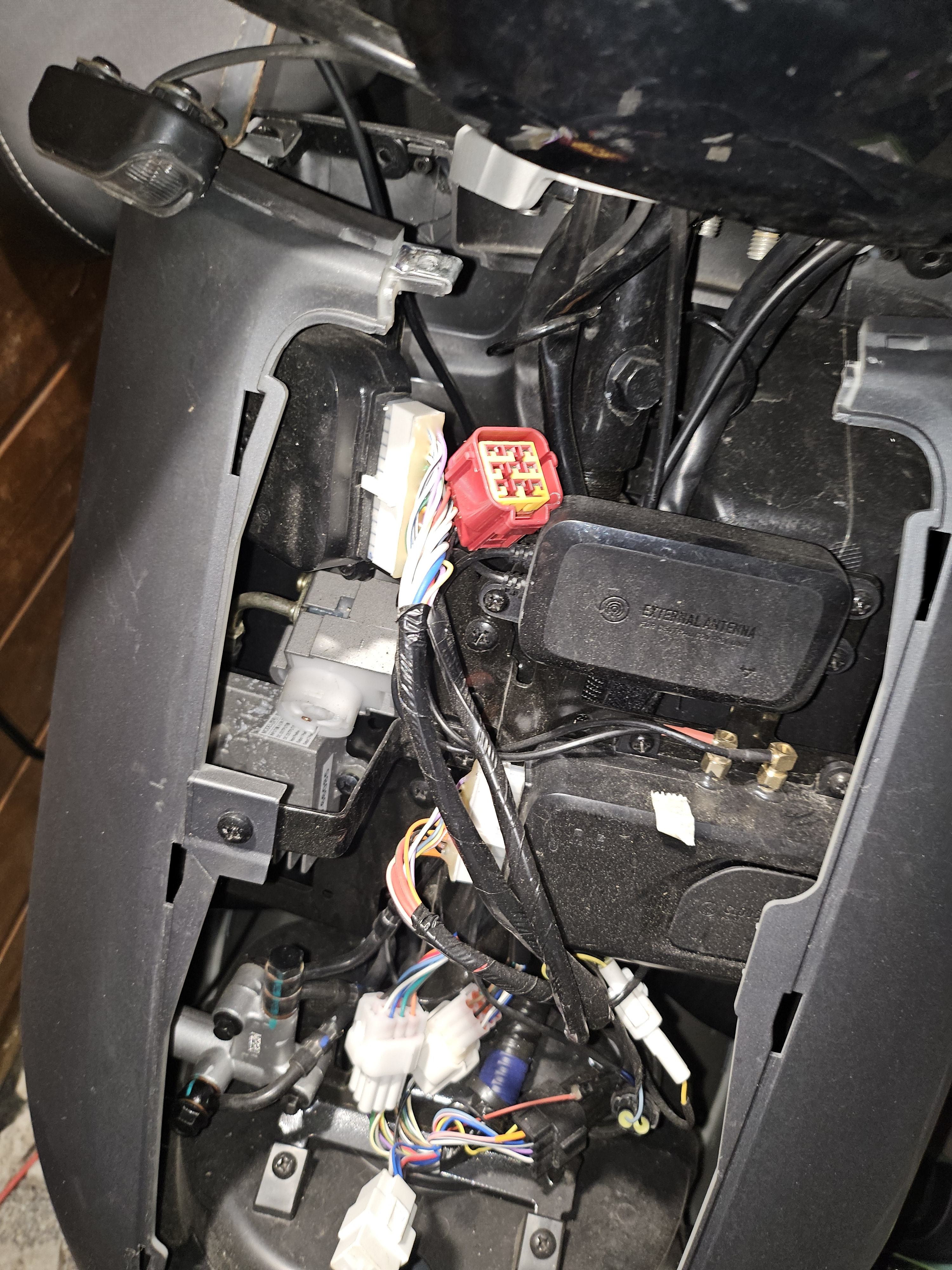 Beim Öffnen des Rollers ist mir außerdem ein roter Stecker vorne und hinten aufgefallen, die nicht angeschlossen sind. Ich bin mir nicht sicher, ob das normal ist oder ob das vielleicht mit dem Fehler zusammenhängt.