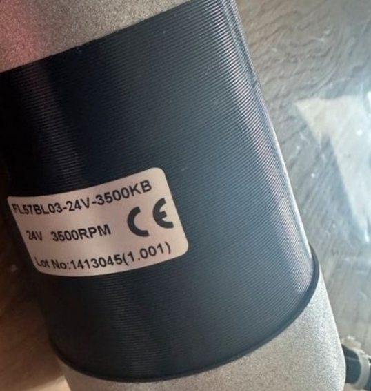 The image shows a close-up of a FL57BL03-24V-3500KB motor, likely a brushless DC motor given its specifications and applications in robotic lawnmowers. The label on the motor provides key details: