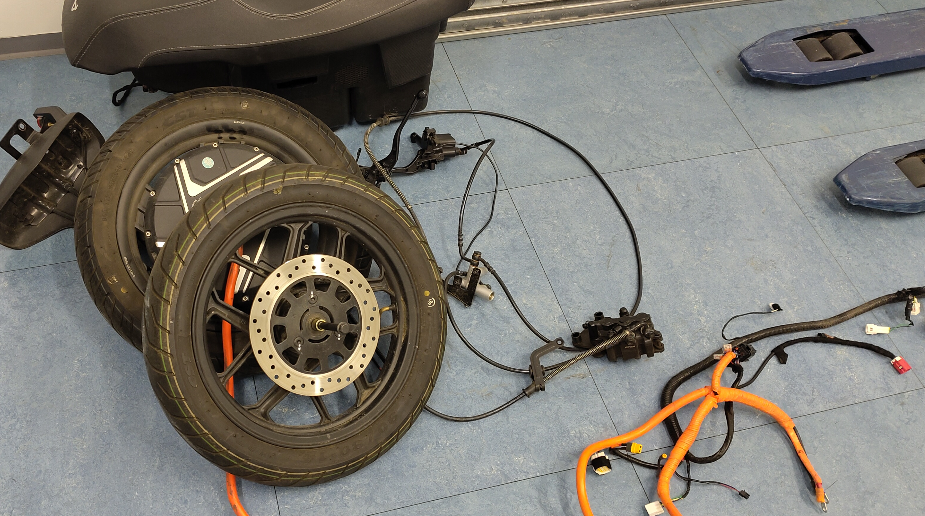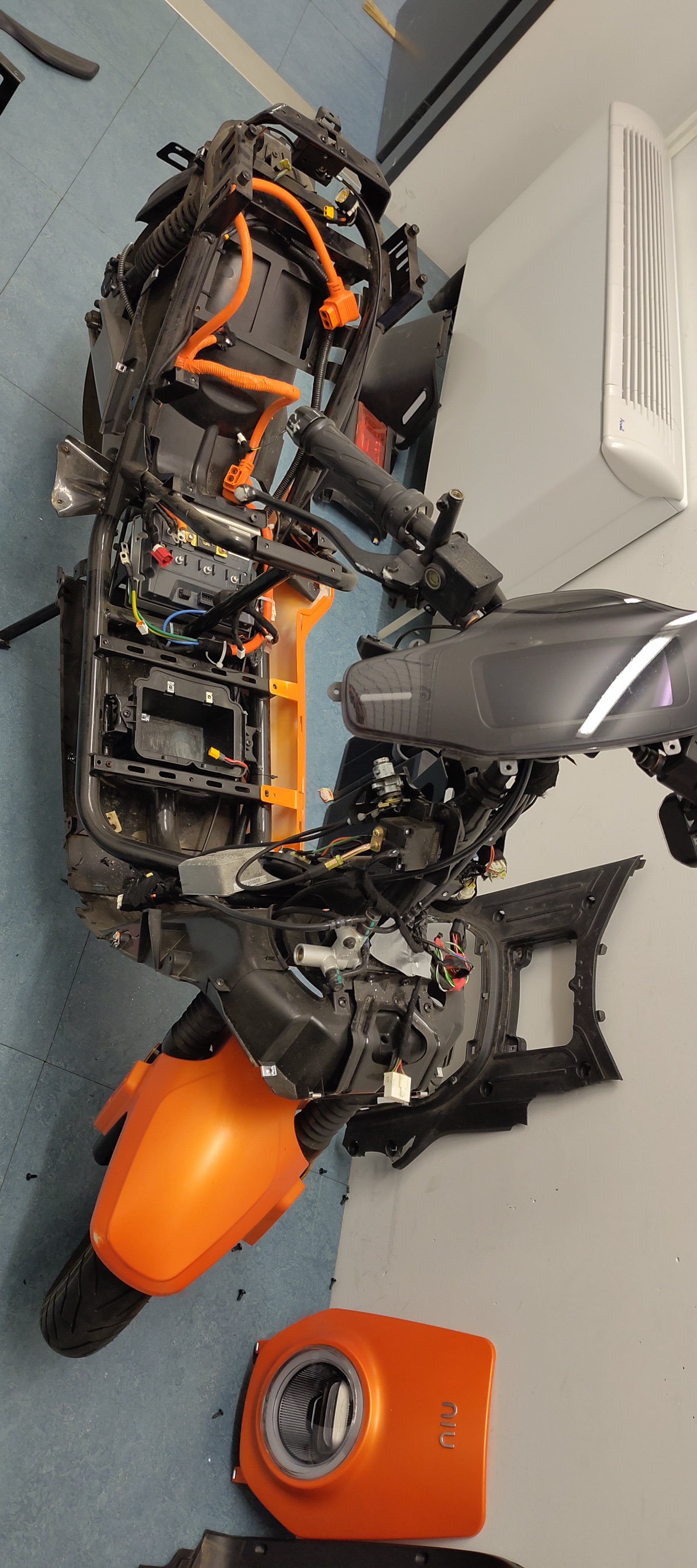 Das Lenker ist verdreht und ggf. die Gabel verzogen, kann aber optische Täuschung sein da die Verkleidung ziemlich gelitten hat. Der Rahmen sieht soweit gut aus. Die Elektronik ist scheinbar heile geblieben, Motor dreht ohne Fehlermeldung.