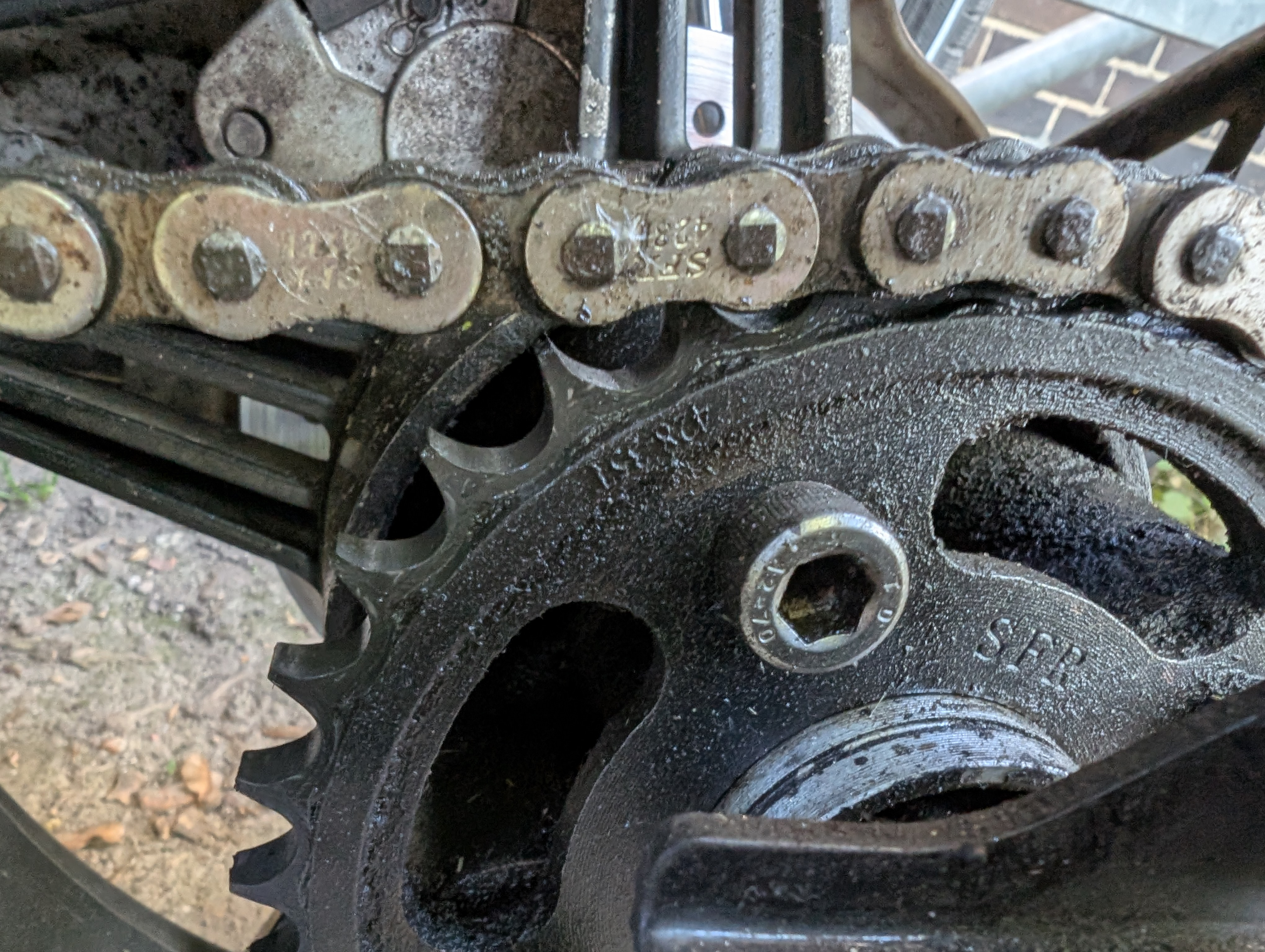 Habe heraus gefunden, dass das hintere Kettenrad ein 35T/428 ist. Als Original nicht in DE erhältlich und im Ausland über 100€. Bei mykettenkit gibt es die Hinteren( glaube ich) aber für das Motorritzel habe ich noch keine Daten gefunden. Ich mache nochmal die Kette ab und messe alles genau aus. Ich glaube, ich mache die Bremsbeläge auch gleich.