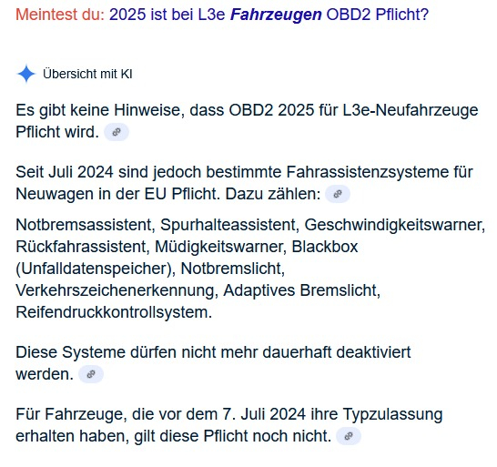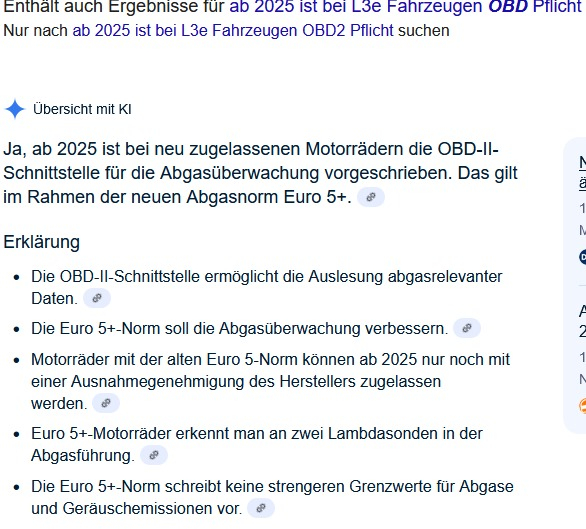 Unabhängig von der Meinung zu Tisto: ab 2025 ist bei L3e Neufahrzeugen OBD2 Pflicht. In wieweit eine Übergangsfrist für Altbestand gilt, würde ich vorher klären wollen. Der Informationsfluss ist nicht optimal. Es sollen sich wohl die Hersteller um Ausnahmegenehmigungen bemühen?Gloria hat geschrieben: Mi 16. Apr 2025, 11:19