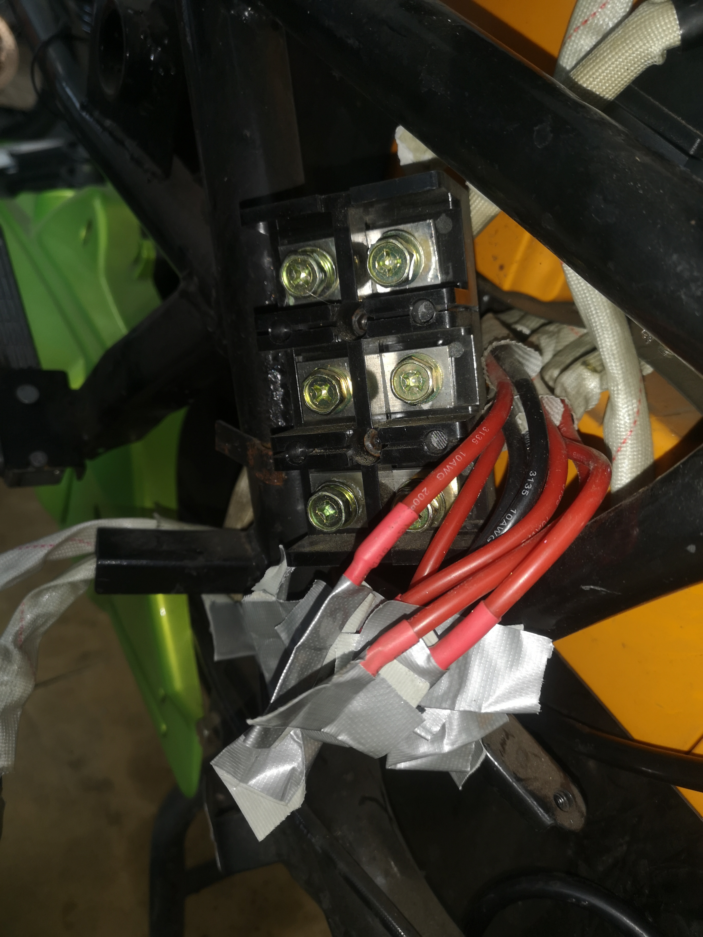 Drei Batteriekabel (ca. 10mm²) sitzen auf einer Schiene. Von dort geht eine kurze Brücke (L ca. 50mm) auf die nächste Schiene (16mm²) und von dort zum Controller (25mm²). Auf dieser Brücke sitzt auch eine Verbindung zum zweiten Verteilerkasten (L ca. 500mm/16mm²), an dem in der selben Weise die anderen 3 Batteriekabel ankommen.