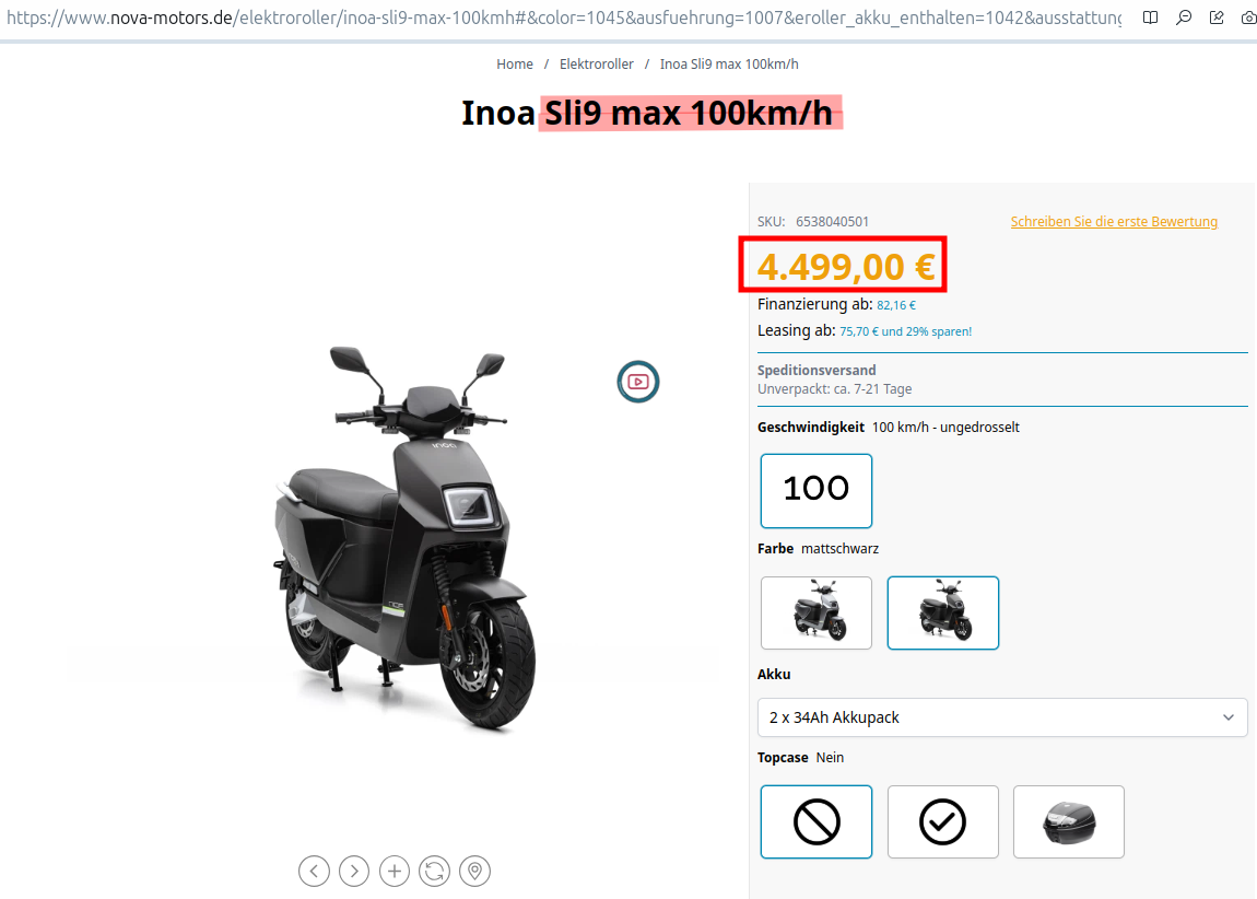 Nova-Motors hat ein neues Modell herausgebracht. Und zwar wurde dem bereits seit zwei Jahren verkauften SLI-9 Max, ein stärkerer Motor spendiert. Ergebnis ist eine höhere Spitzengeschwindigkeit von 100 km/h (bisher nur 80 km/h).