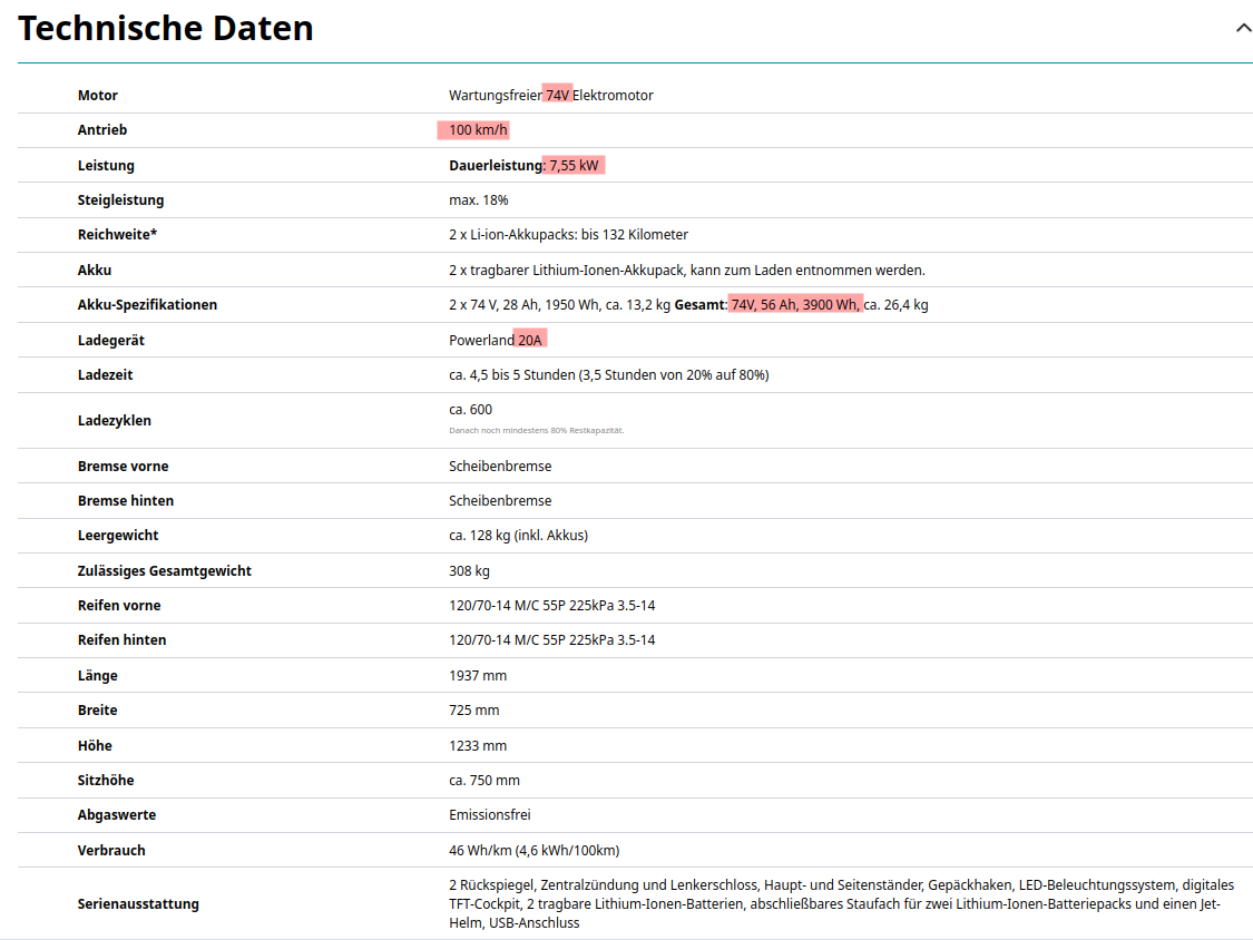 Wesentliche Änderungen sind wie erwähnt der Motor, der nun mit 74 V anstatt bisher 60 V betrieben wird. Die Akkukapazität hat dagegen sogar leicht abgenommen. Und zwar von 4.080 Wh auf 3.900 Wh. Dies führt bei der nun möglichen höheren Endgeschwindigkeit von 100 km/h aber zwangsläufig zu einer geringeren Reichtweite.