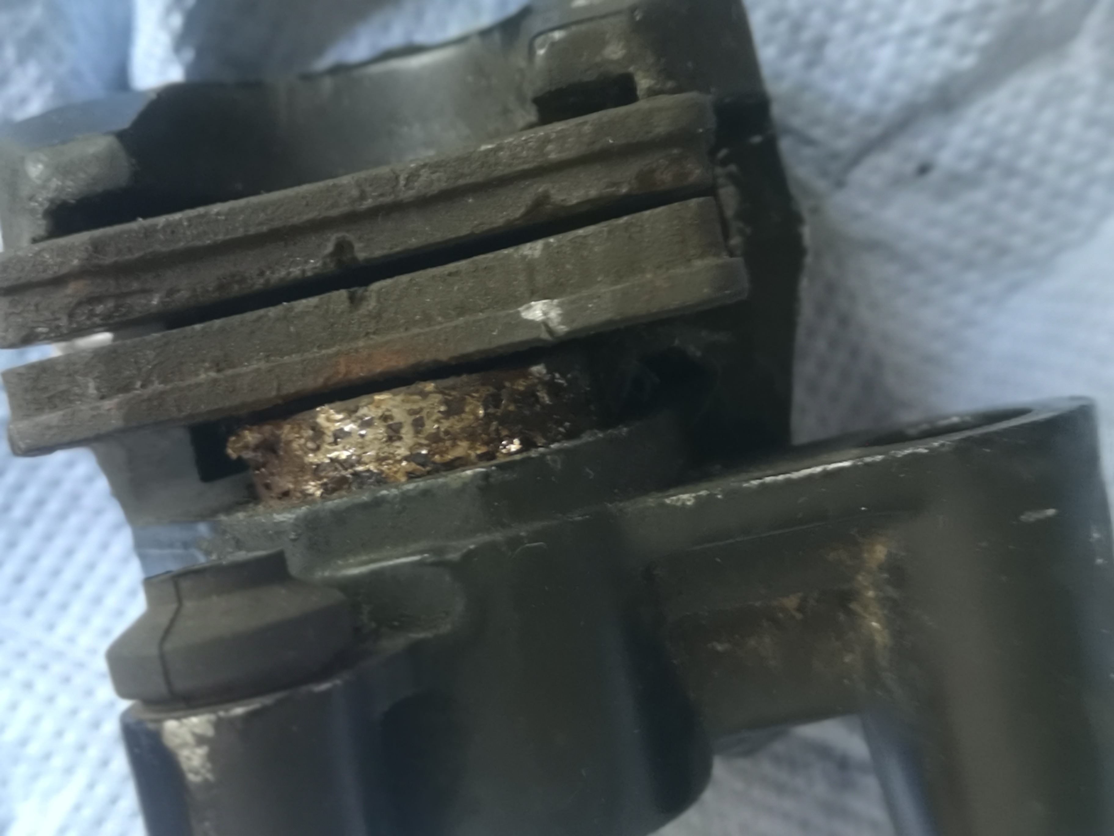 Dazu den alten Belag nochmal gegen die Kolben legen und gleichmäßig drücken; damit vermeidet man Beschädigungen an den empfindlichen Kolben. Die sollte man vor dem Reindrücken reinigen und prüfen, ob die Oberflächenbeschichtung abblättert. So sah es bei einem alten Luxxon aus, den ich grade in der Werkstatt habe