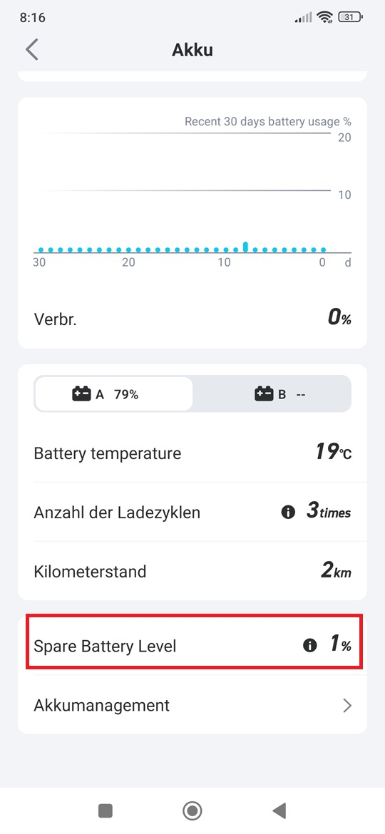 Die spare battery ist in der Ecu, zentrale Steuerelektronik vorne drin. Die Anzeige mit den 0prozent in der App spinnt aber gerne Mal, sagt nicht viel aus