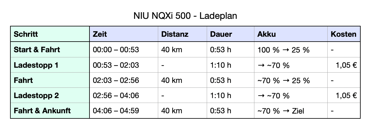 eine 120-140km lange Freizeit-Tour mit einem NIU-Roller machen zu können. (für mich ein Kaufkriterium). Dazu habe ich mal am Beispiel eines NIU NQXi 500 (wobei es auch für alle anderen Roller mit 4kWh Akku) gilt, eine Beispiel "Ladestrategie" gemacht. Ziel: Möglichst kurze Reisezeit, aber auch vermeidung von ewig langen Ladezeiten - also das Finden des Sweetspots zw. Laden und Reisequalität. Nach etwas rumrechnen und einbeziehen der Erfahrungen der E-Autofahrer, komme ich auf diesen Plan: