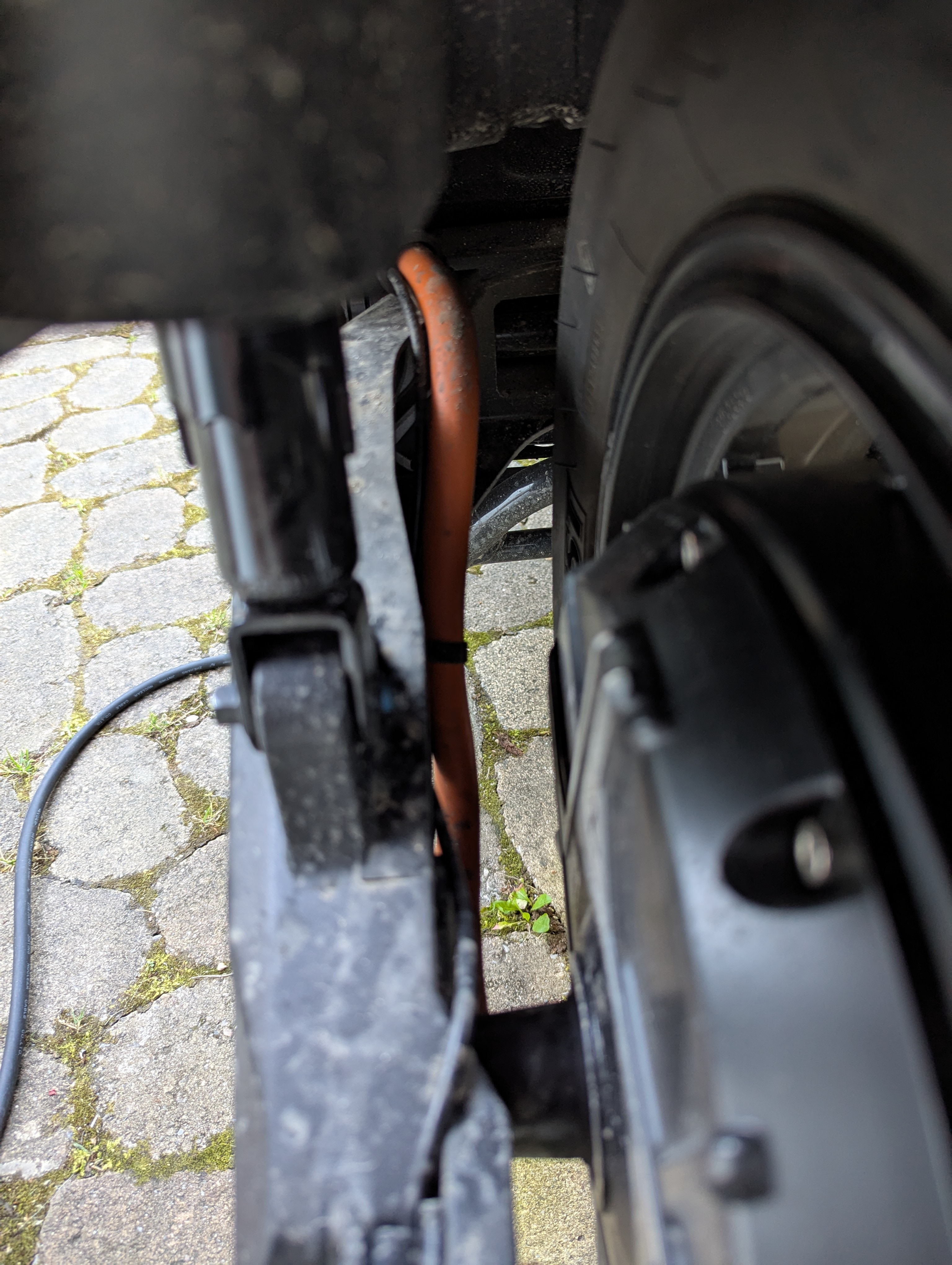 Dieses dicke, orangene Kabel wird von vorne nach hinten zum Motor über die Hinterrad-Schwinge links vom Rad geführt. Fixiert ist es an zwei Stellen: