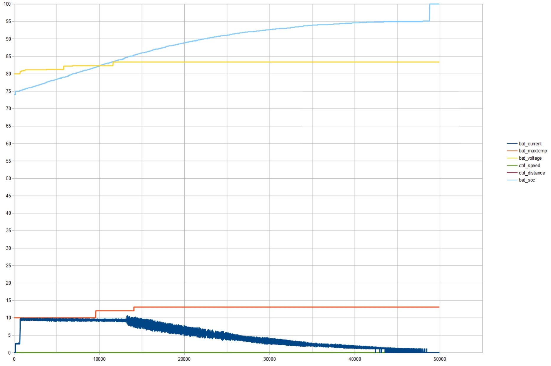 Hier mal noch ein Ladekurve meines Akkus aus der ich schlussfolgerte, dass 4.1V (82V) allein nicht genügen um annähernd an 100% ranzukommen. Hier in der Kurve sehe ich bei 82V halt nur 80% SOC, wobei es noch keine CV-Phase gab.