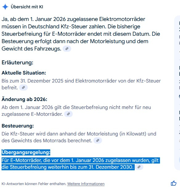 Ist es richtig, dass Elektromotorraeder die nach dem 1.1.2026 zugelassen werden dann Steuern zahlen muessen? Sollte man auf dem Schirm haben!