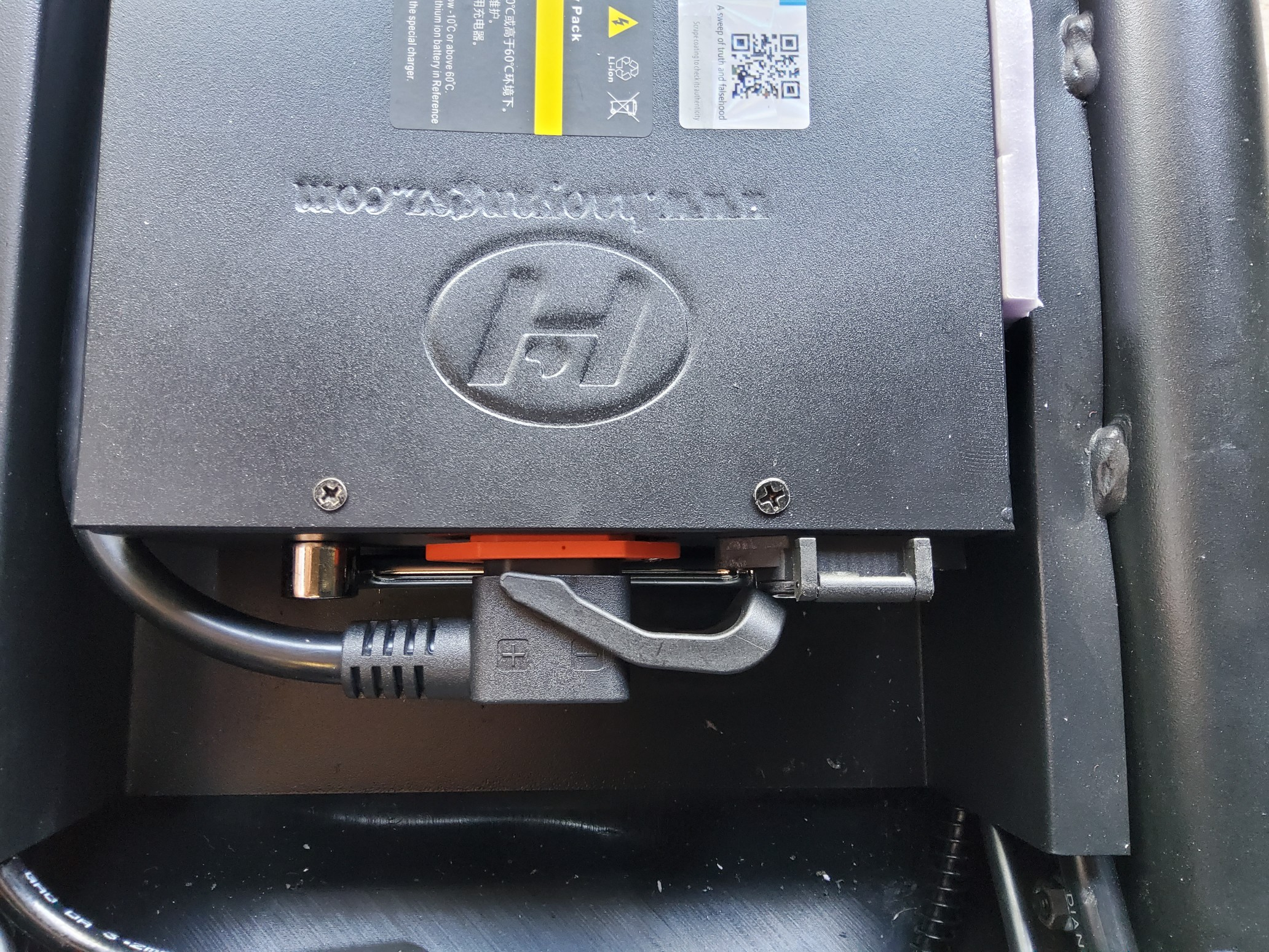 Am Akku unter dem Sitz ist auch ein Ladestecker, an dem du das Ladegerät anschließen kannst.