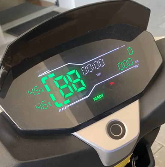 Das Tachodisplay zeigt dann ausschließlich 1. die Akku-Daten, die von den beiden BMS gesendet werden, sowie 2. die Ausgabedaten des (Master-)Motor-Controllers an. Vermutlich werden hier korrekte Akku-Daten mit 45% und 46% Akkufüllstand angezeigt.