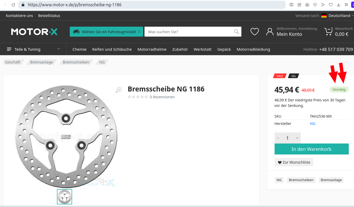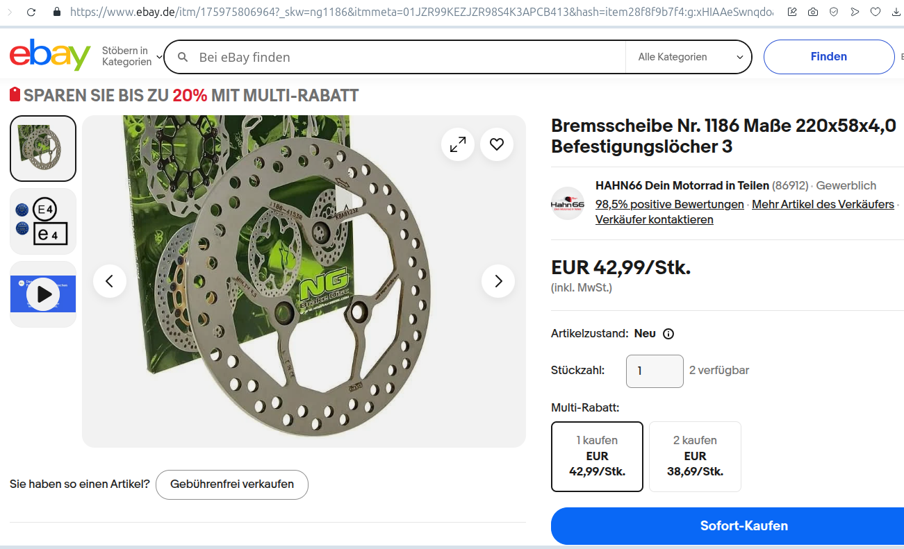 Wie zu erwarten, führen die Kauflinks von eBay mittlerweile ins Leere. Aber kein Problem: Die Bremsscheibentypenbezeichnung ist mit NG1186 schließlich bekannt.