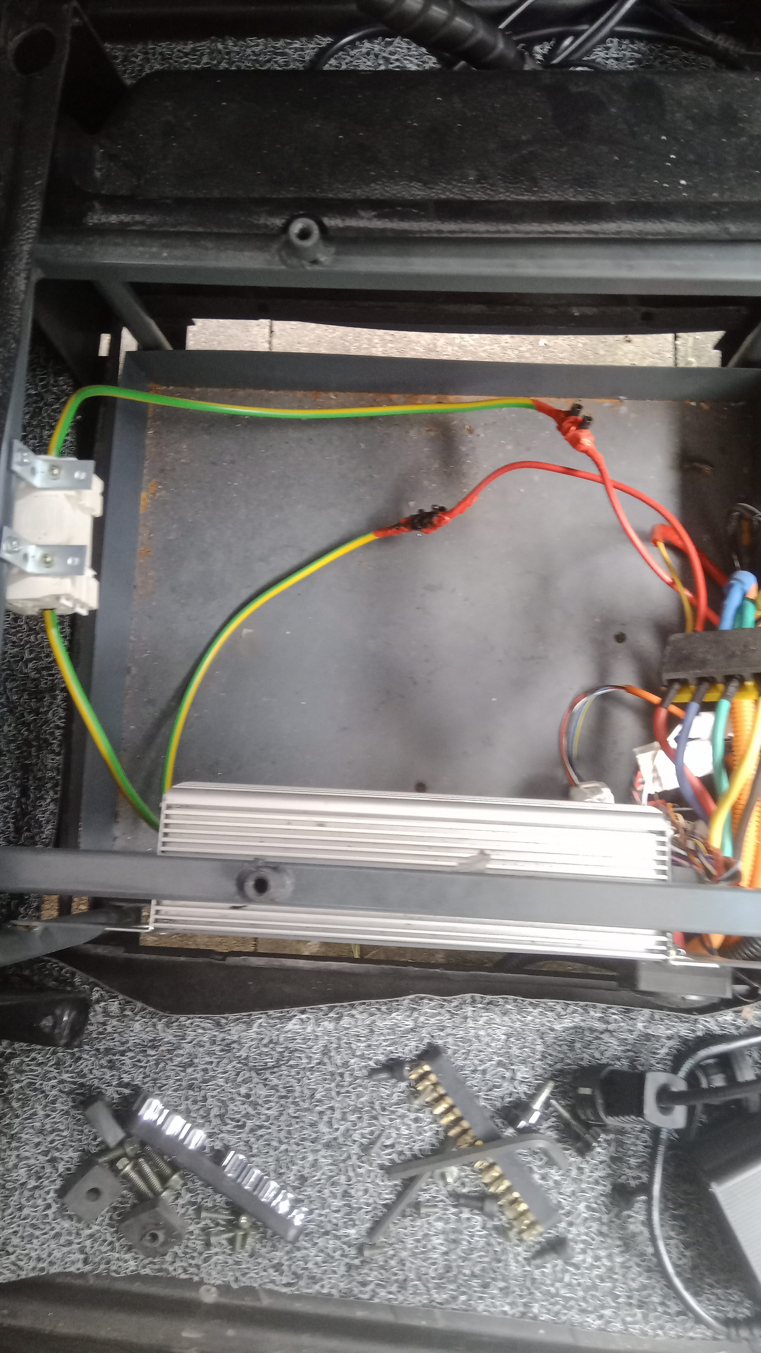 Mal ein paar Bilder vom Controllersaal unterm Sitz.Die Verbindungen der Akkus sind fest.Die Stecker ohne Oxydationsspuren und fest sitzend.Habe den gròßeren,weißen Stecker jetzt mal mit Kabelbinder am Chassis befestigt.Der wackelte so frei rum.....keine erkennbaren Kabelbrüche bis hier.