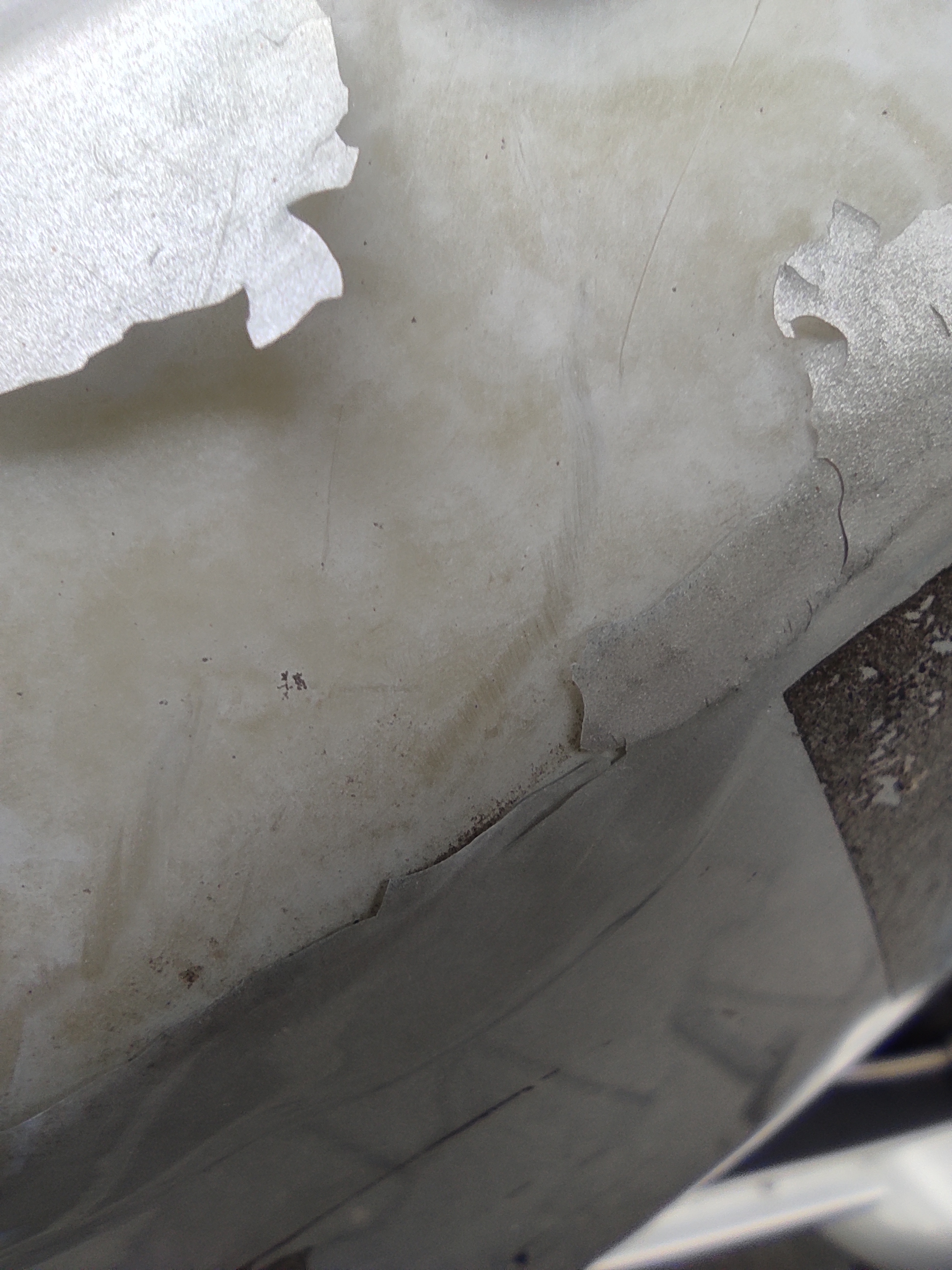 Die Wanne muss ich reparieren. Mir sind bei einem Sturz bei der Wanne die linken Schraubenaufnahmen abgerissen (Foto). So wie es aussieht, hat da schon vorher mal jemand irgendwie geklebt.