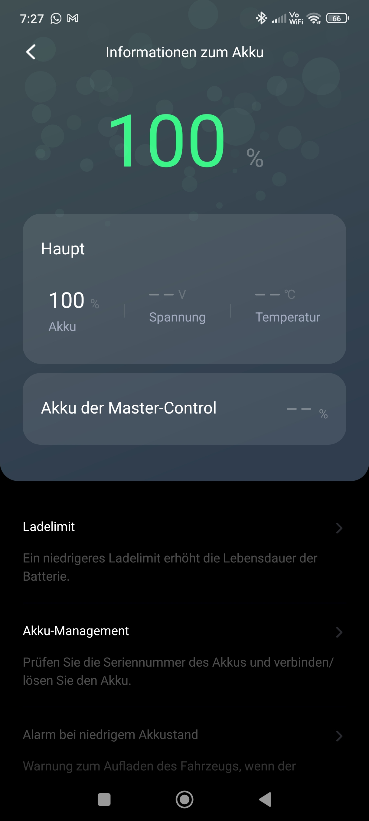 Was mir noch aufgefallen ist, ist das in der Übersicht des Akkus in der APP keine Spannung, keine Temperatur und auch kein Ladestand des Backup-Akkus (Master-Control) mehr angezeigt wird (siehe Bild).